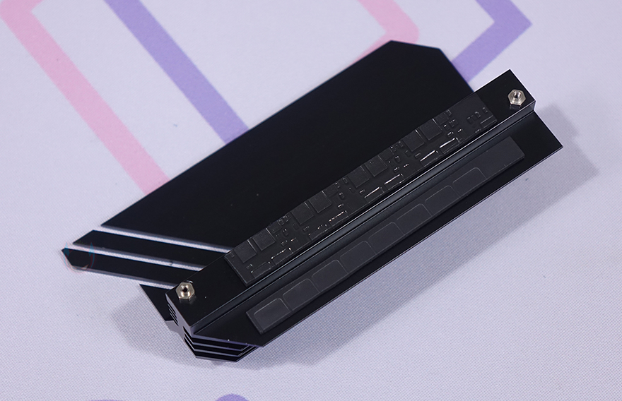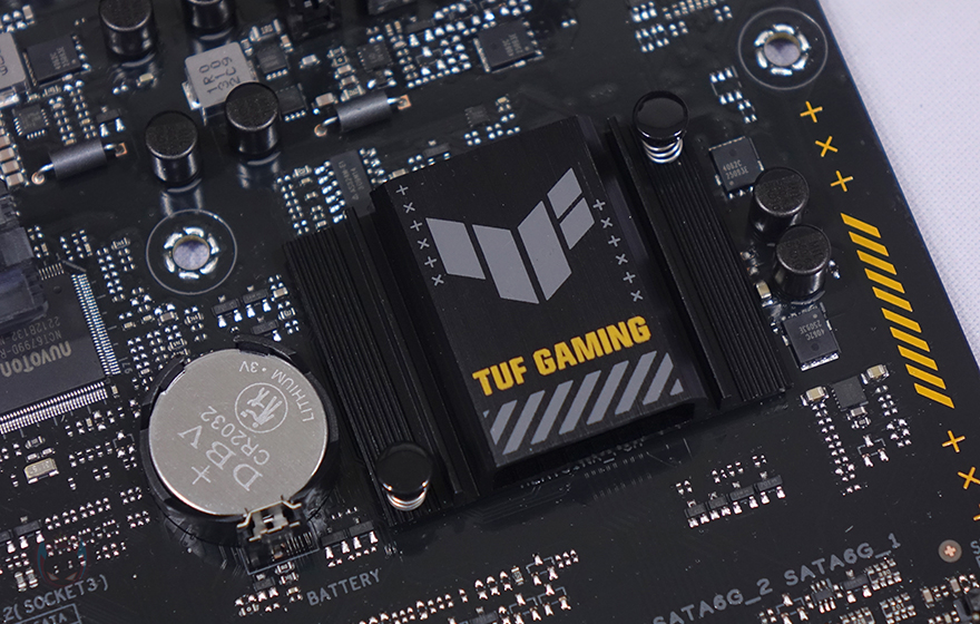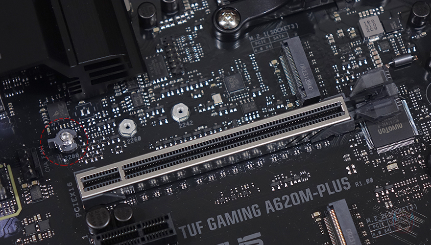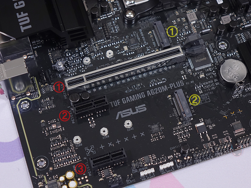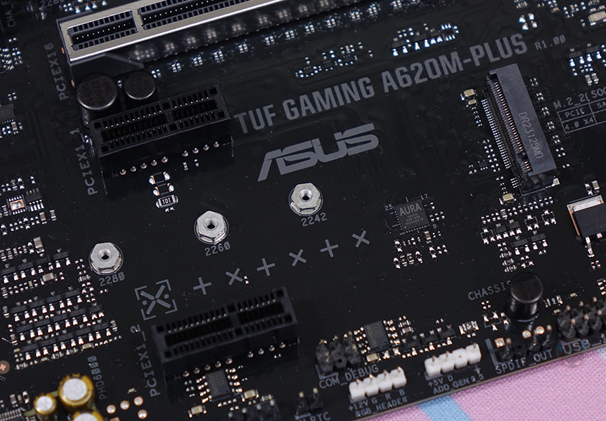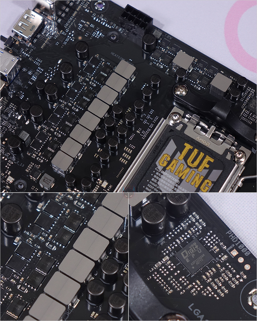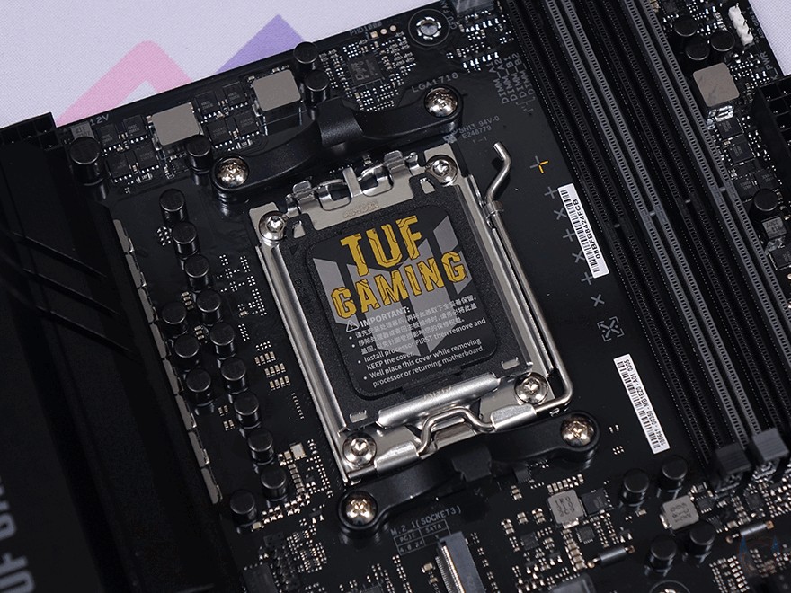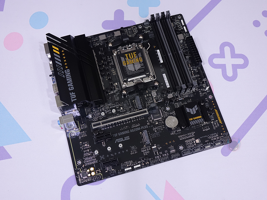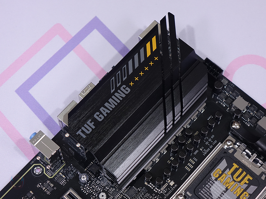 본격적으로 ASUS TUF Gaming A620M-PLUS 메인보드를 살펴보면, M-ATX 플랫폼 규격으로 CPU 소켓은 AMD 라이젠 7000 시리즈 CPU 출시와 함께 AM5 소켓으로 바뀌었습니다. CPU에 핀이 있던 PGA방식에서 인텔처럼 소켓에 핀이 있는 LGA방식으로 바뀐 거죠. 소켓 기준 왼쪽으로 배치되는 전원부에는 큼지막한 방열판이 장착되어 있는데, TUF Gaming 로고를 새겨놨으며, 분해하면 안쪽에 전원부 모스펫 발열 해결을 위해 써멀패드가 기본 부착되어 있습니다.