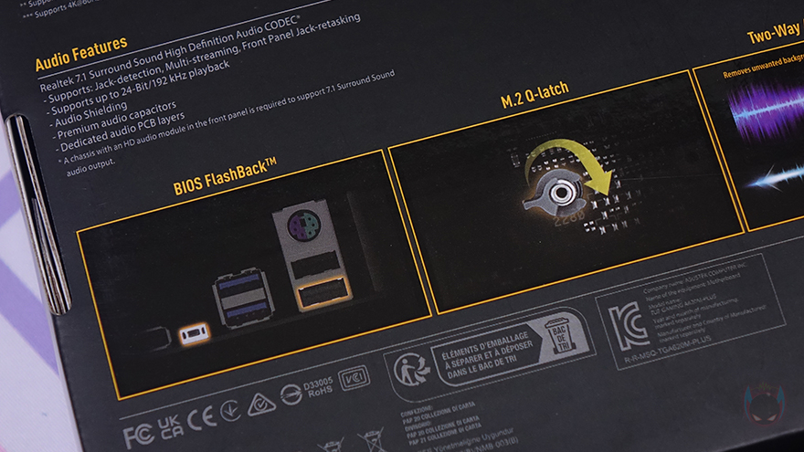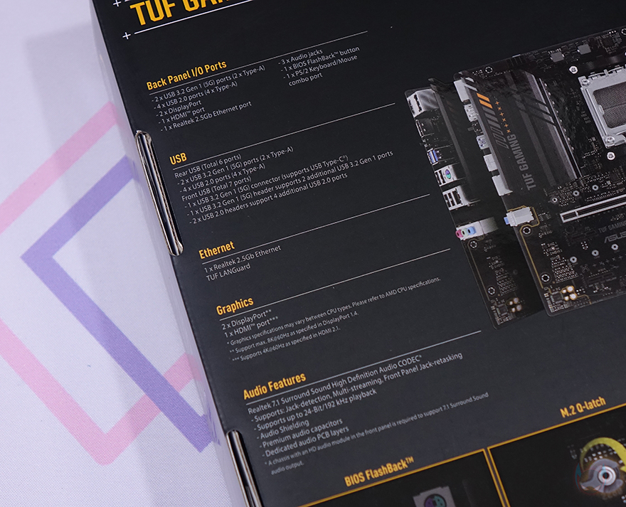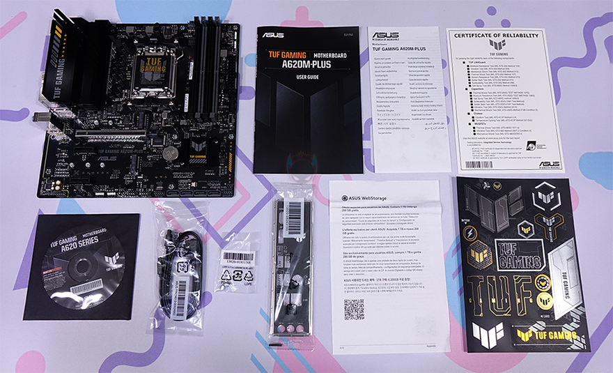 박스 후면에는 제품 풀-샷 이미지와 함께 제품 사양을 상세하게 표기해놨는데, 가운데 이미지 기준 오른쪽으로는 CPU, 칩셋, 메모리, 저장장치, PCIe 슬롯 사양을, 왼쪽에는 백패널 I/O 포트, USB, 이더넷, 모니터 출력 포트, 내장 오디오 부분을 표기해 놨습니다. 그리고, 아래에는 주요 특징으로 바이오스 FlashBack, M.2 Q-래치, 사운드 노이즈, 기가비트 랜 언급을 해놨죠. 박스를 열어보면, 메인보드는 정전기방지 보호비닐에 포장되어 있으며, 제품구성은 TUF Gaming A620M-PLUS 메인보드, 제품 설명서, 퀵가이드, TUF 인증서, 드라이버 CD, SATA 케이블 2개, M.2 SSD 나사, 백패널 I/O 실드, TUF 로고 스티커로 이루어져 있습니다.