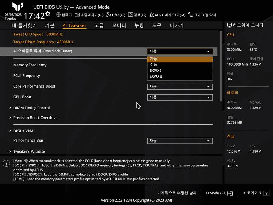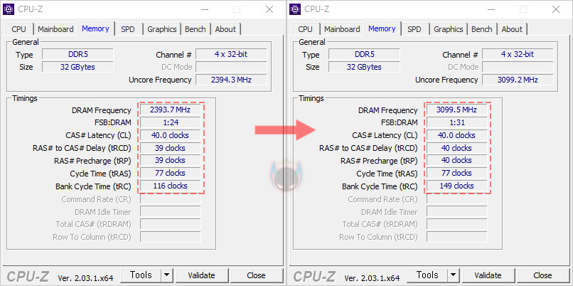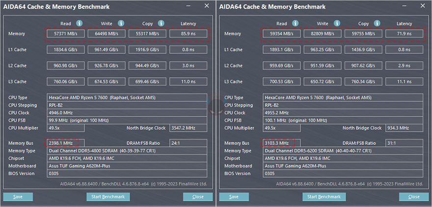 그리고, 앞서 언급했듯이 AMD A620칩셋은 최하위 칩셋이기 때문에 CPU 오버크럭을 지원하지 않습니다. 하지만, 메모리 오버클럭은 지원하고 있죠. 그래서, CMOS - Ai Tweaker 메뉴에서 수동이나 AMD 메모리 프로파일인 EXPO를 갖춘 메모리라면 손쉽게 오버클럭을 할 수 있습니다. 이 부분이 A620 칩셋 메인보드의 가장 큰 특징이기도 하죠. 실제로 앞서 잠깐 언급했듯이 A620M-PLUS는 6200MHz이상의 오버클럭을 지원하는데, AMD 라이젠 7000 시리즈 CPU를 사용하면 대부분 6200MHz 클럭까지는 손쉽게 오버클럭을 성공하기 때문에 A620M-PLUS 메인보드에서 6200MHz으로 오버클럭을 적용해 봤습니다. 결과는 손쉽게 오버클럭이 적용되는 것을 확인할 수 있으며, DDR5의 기본 클럭인 4800MHz일때보다 6200MHz일 때 시스템이 좀 더 향상되는 것을 확인할 수 있죠.