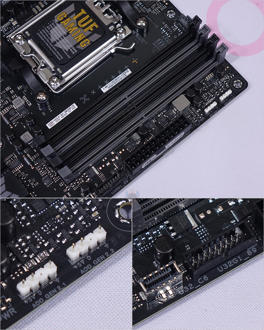 전원부는 6+2+1 페이즈 구성으로 모스펫 드라이버와 상하단 모스펫이 나뉘어진 아날로그 방식입니다. A620칩셋이 가장 최하위 칩셋이고, CPU 오버클럭을 지원하지 않기 때문에 굳이 디지털 전원부까지 갖출 필요는 없는 거죠. 그래도, PWM 컨트롤러 칩셋은 ASUS 디지털 컨트롤러인 Digi+ EPU를 탑재하고 있어서, 하이브리드 전원부입니다. 메모리는 DDR5 지원하는데 슬롯은 총 4개 구성으로 최대 128GB 용량에 6400MHz이상 클럭을 지원합니다. 뒤에서 확인하겠지만, A620칩셋이 최하위 칩셋이지만, 메모리 오버클럭은 지원을 합니다. 이게 인텔과 AMD의 가장 큰 차이점이죠. 그리고, 슬롯 주변으로는 5V ARGB 헤더와 USB 3.2 Gen1 헤더와 Type-C 헤더가 배치되어 있습니다.