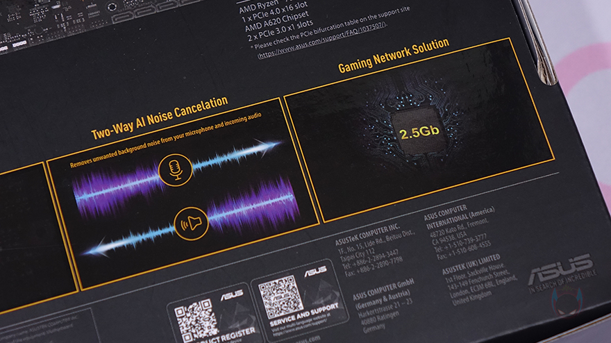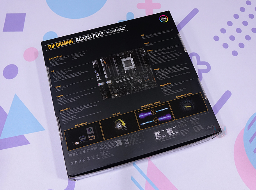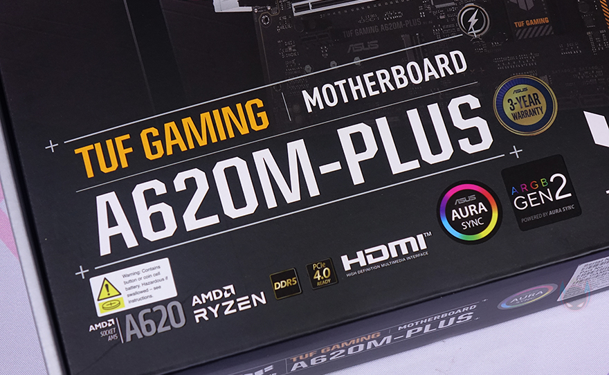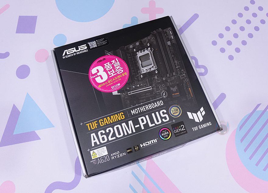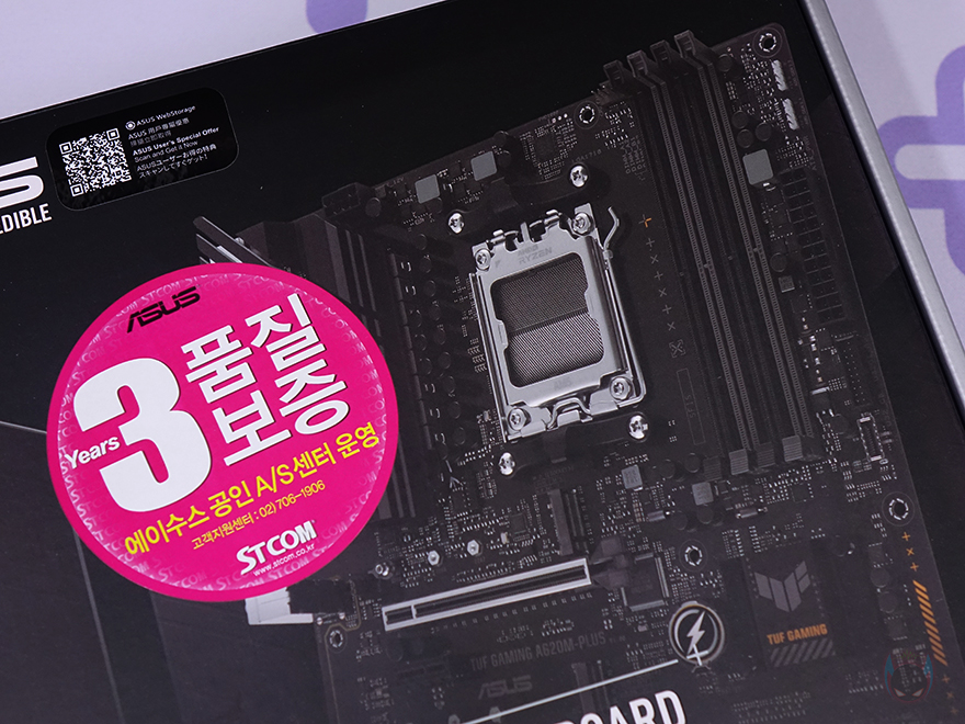 ASUS 메인보드 제품들은 대부분 박스 전면에 제품 이미지를 담고 있죠. ASUS TUF Gaming A620M-PLUS 역시 박스 전면에 해당 모델의 제품 이미지를 담고 있으며, 국내에서 가장 오래된 ASUS 공식수입사 STCOM의 3년 무상보증 기간 스티커도 확인할 수 있습니다. 물론, 모델명과 함께 AMD 최신 라이젠 CPU 지원, DDR5 지원, ASUS AURA Sync 등의 지원 표기도 확인할 수 있죠.
