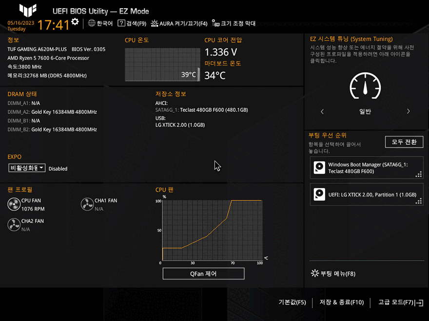직접, ASUS TUF Gaming A620M-PLUS 메인보드를 사용해 보면, 일단 바이오스 CMOS 인터페이스와 메뉴는 TUF Gaming 라인업의 다른 제품들과 거의 동일한 형태입니다. F7키를 누르면 EZ Mode와 Advanced Mode를 서로 전환할 수 있죠. 또한, 칩셋에 따라 세부 메뉴가 조금 차이 있을 수 있으나 Advanced Mode에서 기본 메뉴들 '즐겨찾기/기본/Ai Tweaker/고급/모니터/부팅/도구/나가기' 메뉴들은 동일합니다.