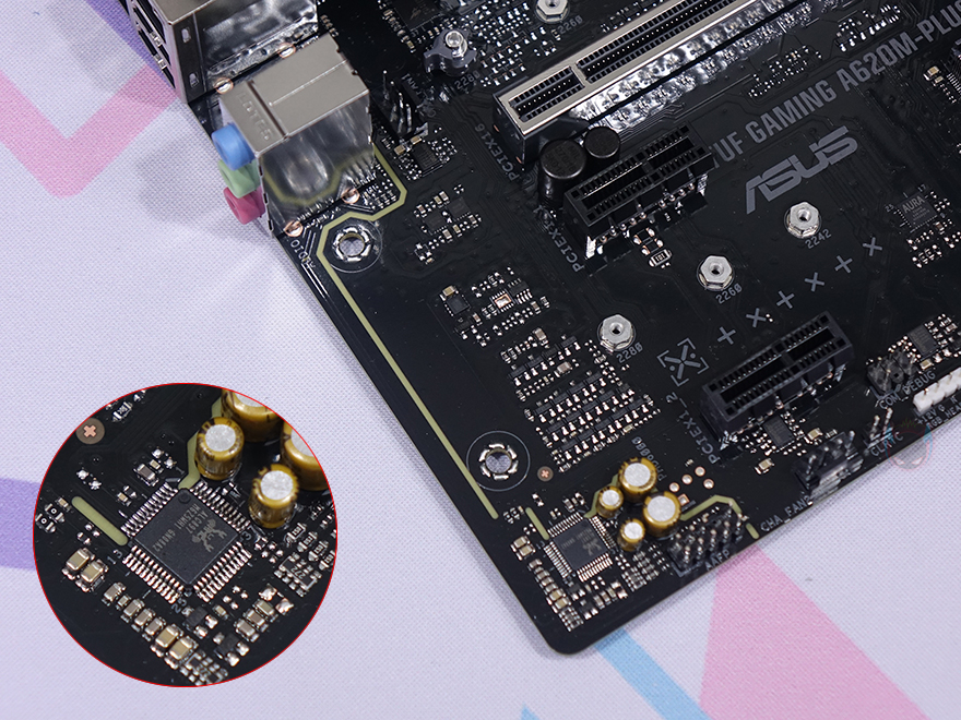 슬롯 기준으로 메인보드 오른쪽에는 메인칩셋 A620이 위치하고 있는데, 발열해결을 위해 방열판이 장착되어 있으며, 아래로는 S-ATA 6Gbps 커넥터 4개와 오른쪽에 PC케이스 패널 케이블과 연결되는 커넥터가 배치되어 있습니다. 그리고, 왼쪽으로는 12V RGB 헤더 2개를 확인할 수 있죠. 슬롯 왼쪽으로는 내장 오디오 부분으로 독립 PCB구간으로 처리했으며, 오디오칩셋은 리얼텍입니다. 끝으로, 백패널 I/O 포트 같은 경우 HDMI 1개, DP 2개의 모니터 출력포트를 비롯해 USB 3.2 Gen1 포트 2개, USB 2.0 포트 2개, PS/2, 2.5Gb 랜포트, 오디오 잭으로 구성되어 있죠. 참고로, USB 3.2 포트 왼쪽에는 바이오스 FlashBack 버튼도 적용되어 있으며, HDMI는 2.1버전(4K@60Hz), DP는 1.4버전(8K@60Hz)입니다.