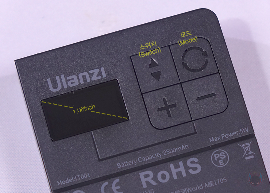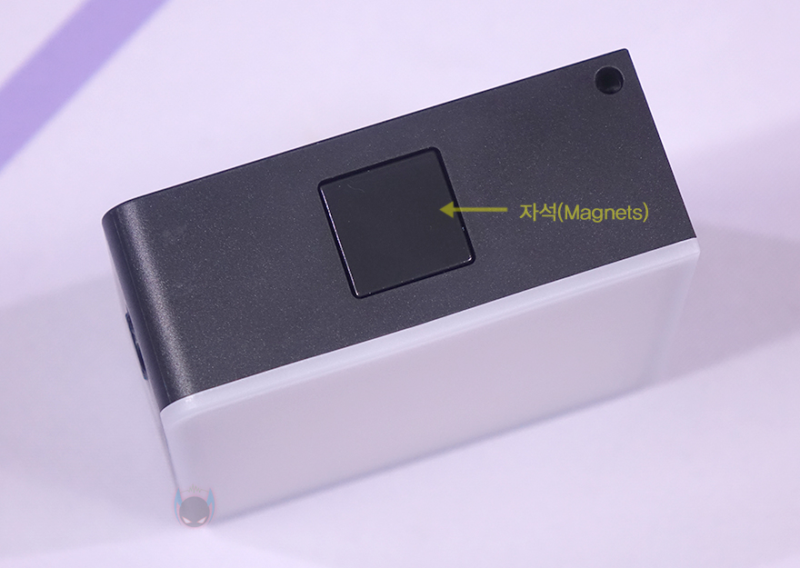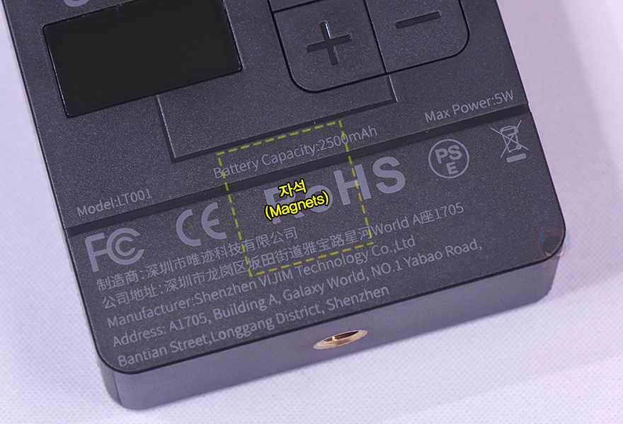 조명 뒷면에는 조작 버튼과 작동 상태를 확인할 수 있는 디스플레이(Display)가 적용되어 있는데, 왼쪽에 배치된 디스플레이는 1.06인치 크기를 가졌으며, 바로 오른쪽에 배치된 버튼에는 색온도/색조&채도/밝기 등 세부설정 메뉴를 선택할 때 사용하는 스위치(Switch), 색온도(CCT)/HSI(RGB)/조명모드(SCENE)로 전환할 수 있는 모드 버튼, 그리고 수치값을 조절하는 +- 버튼이 있죠. 그리고, 바로 아래에는 중앙 부분쯤에는 내부에 자석(Magnet)이 내장되어 있어서 철재 같은 소재에 바로 조명을 부착해서 사용할 수 있습니다.