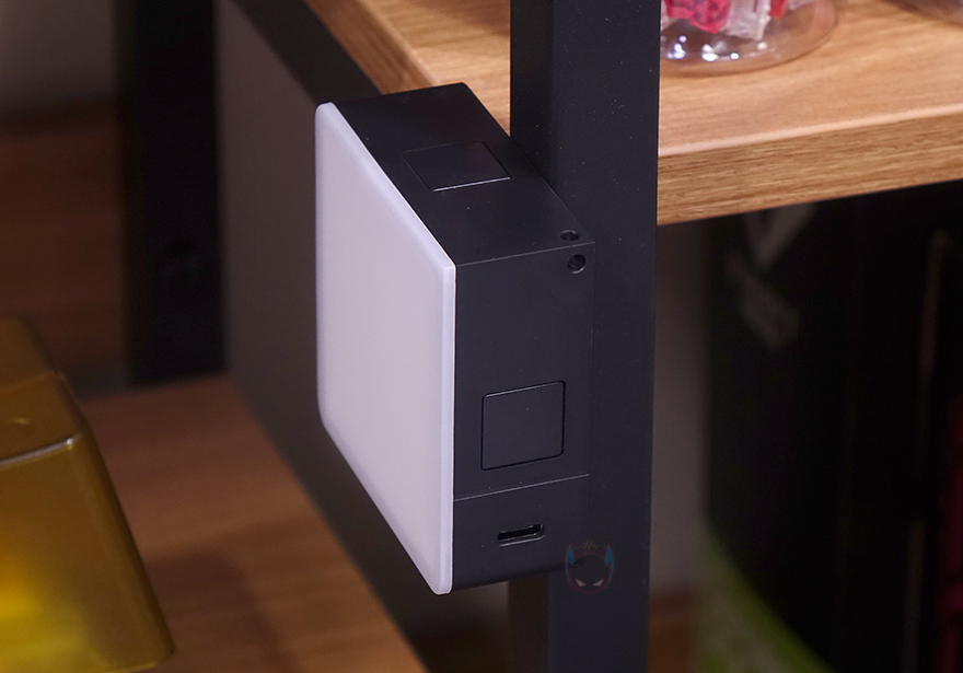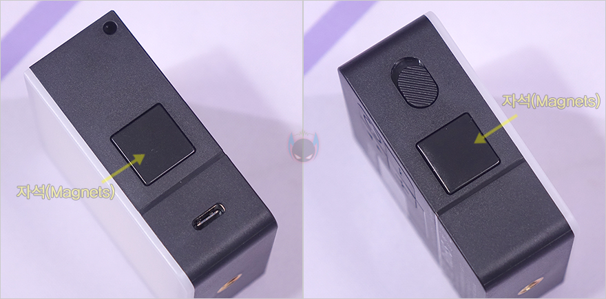 물론, 뒷면에 내장된 자석 외에도 VL49 RGB Pro 미니 조명 상단과 좌우 측면에 ㅁ자 부분이 모두 자석이라 원하는 위치로 부착할 수 있습니다. 그리고, 오른쪽 측면에는 충전 시 사용되는 USB Type-C 포트가 배치되어 있으며, 왼쪽 측면에는 전원 On/Off 스위치가 적용되어 있죠. 또한, 조명 아랫부분에는 삼각대나 제공되는 1/4인치 핫슈마운트에 연결할 수 있게 1/4인치 나사홀이 적용되어 있습니다. 그리고, 디스플레이 위치에 모서리 부분에는 줄 같은 스트랩(strap)을 사용할 수 있게 구멍도 처리되어 있죠.