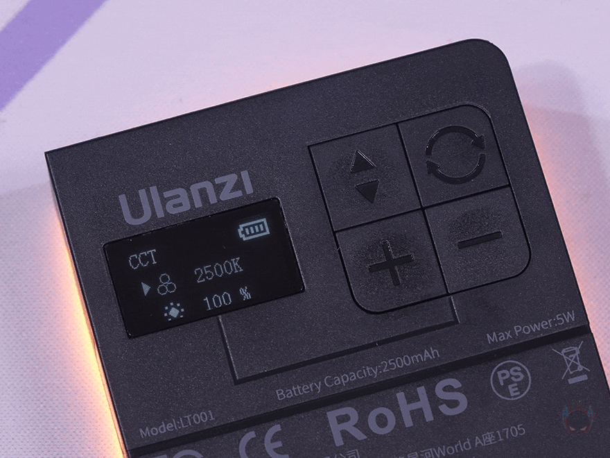 직접, Ulanzi VL49 RGB Pro 미니 조명을 사용해 보면, 왼쪽 측면에 전원 스위치를 켜면 바로 LED 빛이 발산하며, 뒷면에 디스플레이(Display)도 켜지면서 실시간으로 작동상태를 모니터링할 수 있습니다. 모드 버튼(Mode button)을 누르면, 색온도(color temperature)→HSI(RGB 조명)→조명모드(SCENE) 순으로 전환할 수 있는데, 색온도는 2500~9000K 범위를 가졌으며, 밝기조절은 0~100%까지 설정할 수 있습니다. 그리고, 색조(Hue)와 채도(Saturation)로 조절되는 HSI는 색조 359, 채도 100까지 설정할 수 있으며, 마지막 조명모드는 총 20가지 모드를 제공해주고 있죠. 물론, 디스플레이를 통해 배터리 잔량도 확인할 수 있으며, 배터리는 2500mAh 용량을 내장하고 있습니다.
