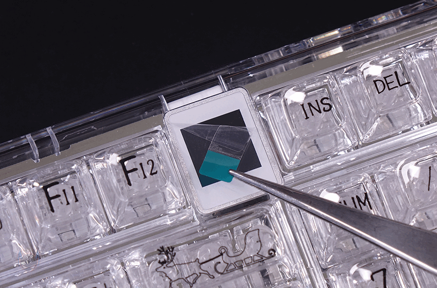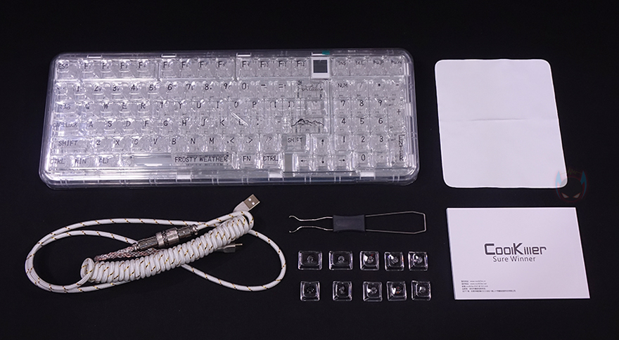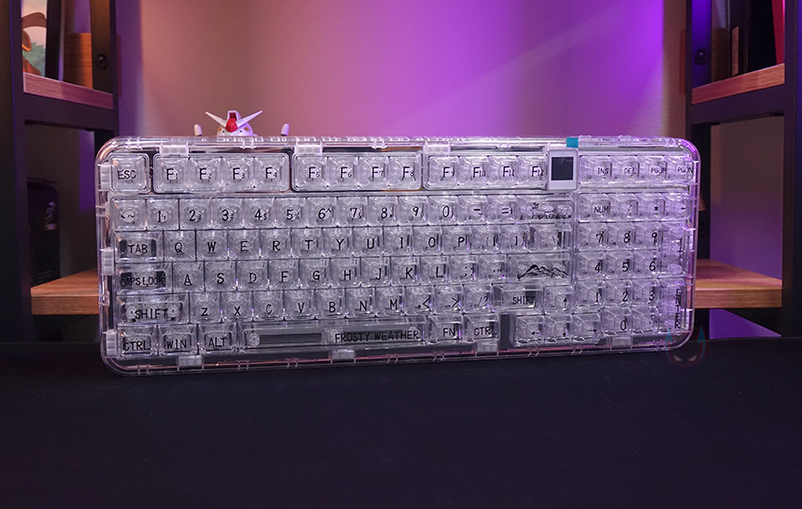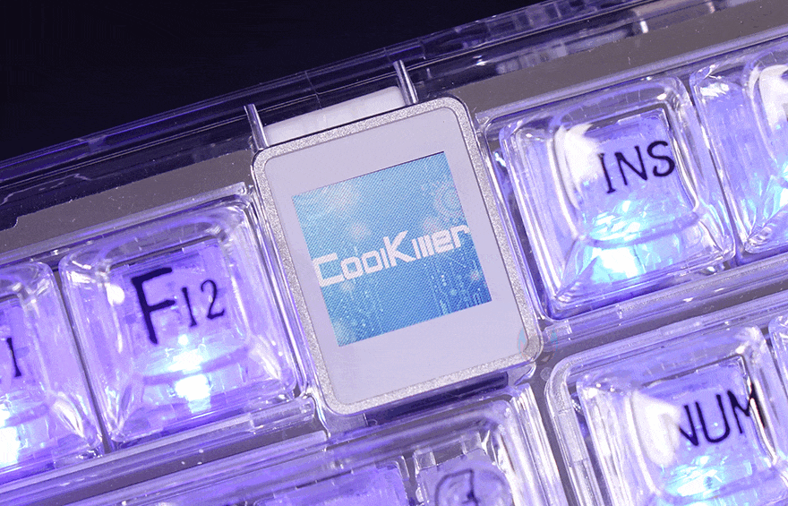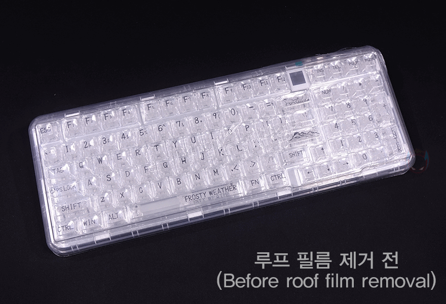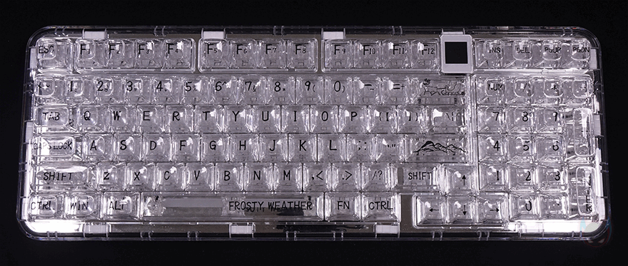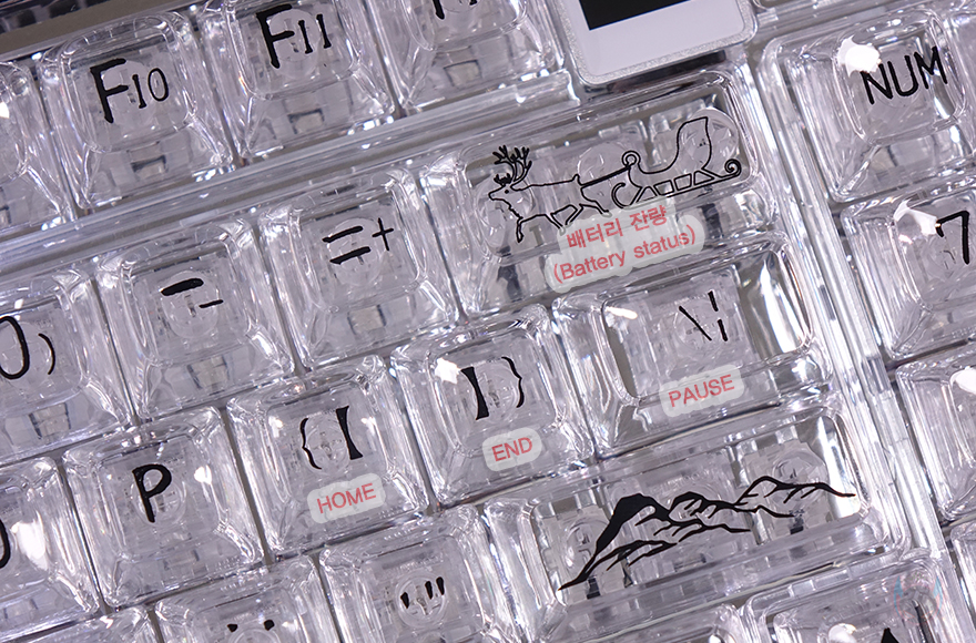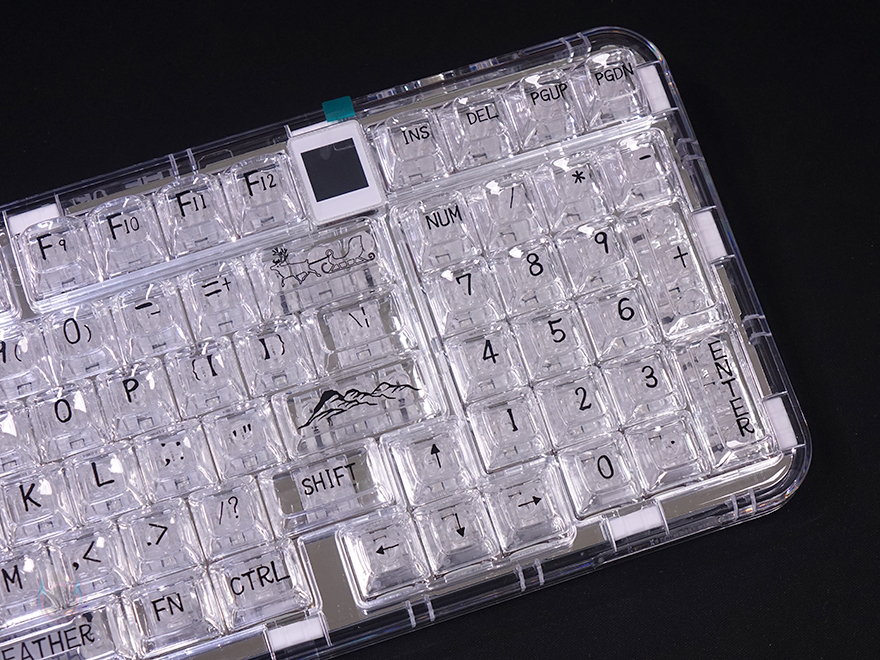 CK98 기계식 키보드는 앞서 언급했듯이 풀-배열이 아닌 98%의 97key 배열로 이런 배열 키보드에서 볼 수 있는 숫자키패드와 방향키를 갖추면서 사이즈를 줄인 형태를 그대로 볼 수 있습니다. 그리고, F12키 바로 오른쪽에는 0.82인치 크기의 디스플레이(Display)가 적용되어 있는데 개봉 시 보호비닐이 부착되어 있으며, 소재는 OLED 패널입니다. 그리고, 키캡 역시 키보드 콘셉트에 맞춰서 투명 키캡(transparent keycap)인데, PBT재질이 아닌 PC(폴리카보네이트)이며, 일부 키캡은 폰트가 아닌 그림이나 문구로 디자인되어 있죠. 물론, 추가 교체용 키캡도 투명 키캡이며 콘셉트에 맞춰서 겨울과 관련된 디자인을 적용하고 있습니다. 또한, 이중사출 방식의 키캡은 아니지만, 약 1.4mm 두께로 충분히 PBT 키캡 못지않게 두껍죠.