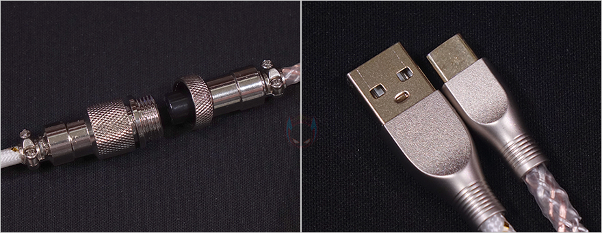 끝으로, 유선시 사용되는 분리형 USB 케이블(cable) 같은경우에는 커스텀 키보드 사용자들이 많이 선택하는 일명 항공-케이블로 케이블 연결 한쪽은 전체 슬리빙 처리와 함께 일부 코일 형태를 갖추고 있으며 길이는 2m가 넘죠. 그리고, 나머지 연결 한쪽 케이블은 투명 슬리빙 처리로 뒤에서 확인하겠지만, RGB 백라이트 효과를 볼 수 있습니다. 물론, USB 인터페이스는 USB Type-C to A로 갖추고 있죠.