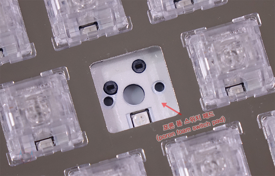 스위치는 CoolKiller의 커스텀 스위치로 역시 투명 컨셉(transparent concept)에 맞춰 스위치 역시 투명합니다. 스위치 케이스, 스템 부분까지 모두 투명하죠. 스위치의 정식 명칭은 Ice Blade로 타입은 택타일(Tactile)입니다. 그리고, 핫-스왑(How-swap) 방식으로 스위치 분리가 가능하고, 분리하면 내부 PCB기판 바로 위에 화이트 색상의 포론 소재의 포론 폼 스위치 패드(poron foam switch pad)가 적용된 것을 확인할 수 있습니다. 또한, PCB기판의 LED도 남향(south-facing)으로 적용되어서 백라이트 효과를 좀 더 극대화되도록 했으며, 보강판은 PC(폴리카보네이트) 소재인데 역시 제품 컨셉에 맞춰서 미러 코팅(mirror coating)을 적용했습니다. 그래서, 전체적으로 CK98 키보드가 더 투명하게 강조되는 효과가 있죠. 물론, 스위치는 3 pin과 5 pin 둘 다 사용이 가능하기 때문에 다른 스위치 호환성이 높으며, 스페이스-바 같은 긴 키들의 스테빌라이저 역시 투명 처리에 체리식으로 적용하고 있습니다.