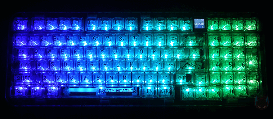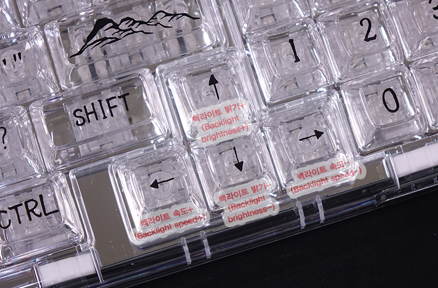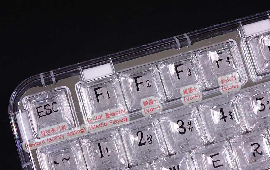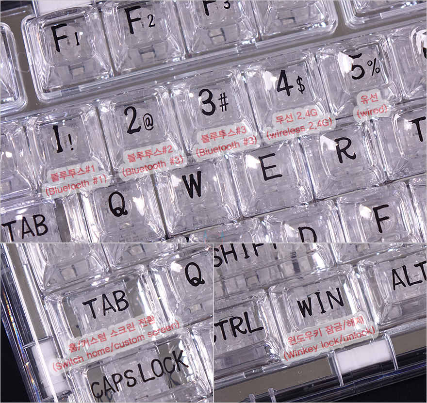 끝으로, CK98 키보드는 투명 컨셉을 가지고 있는데, 키캡 같은 경우에는 폰트가 적용되어 있습니다. 그래서, 키캡까지 완전히 투명으로 바꾸면 어떨까 싶어서 폰트가 없는 완전 투명 키캡으로 교체를 해 본 결과, 전원을 켜지 않거나 백라이트를 껐을 때(Off)는 더 투명한 느낌을 주지만, 백라이트가 켜지면(On) 큰 차이가 없습니다. 그 이유는 CK98 키캡의 폰트위치가 남향의 LED를 가리지 않기 때문이죠. 그래서, 굳이 사용자가 더 완벽하게 투명으로 바꿀 필요는 없겠습니다.