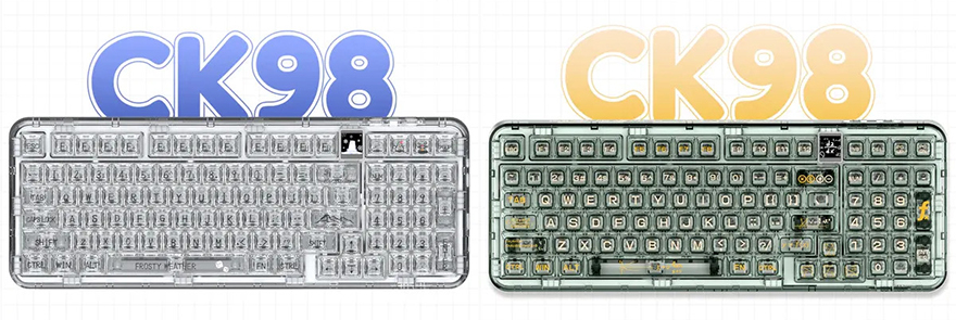 본격적으로 CoolKiller CK98 기계식 키보드를 살펴보면, 일단 배열은 트렌드 중 하나인 100%미만의 배열로 정확히는 98% 배열에 97 키(key)입니다. 그리고, 앞서 언급했듯이 색상에 따라 2가지로 나왔는데 리뷰에선 무색투명(transparent)의 Polar Bear로 역시 클리어 디자인이 가장 눈길을 잡습니다. 특히, 유광으로 처리되었기 때문에 마치 유리 또는 크리스탈 느낌(glass or crystal feel)을 주죠. 그리고, 키보드 하우징 역시 트렌드 중 하나인 가스켓(Gasket) 방식으로 케이스가 투명해서 쉽게 알아볼 수 있습니다.