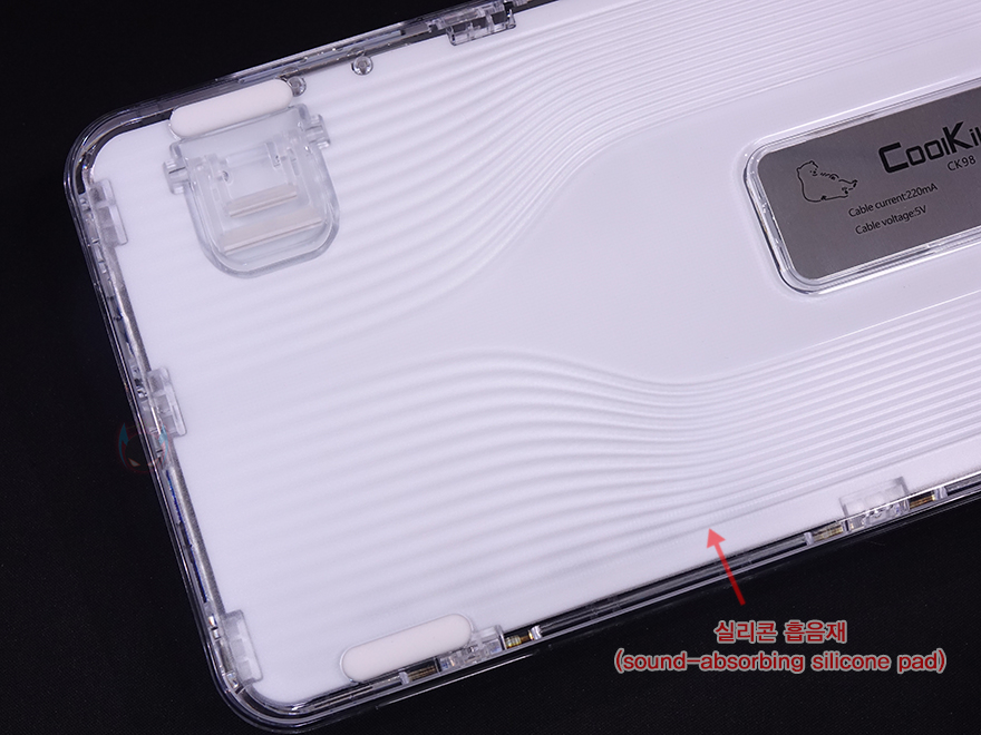그리고, 키보드 밑바닥부분에는 미끄럼방지 패드부착과 함께 투명하기 때문에 내부 모습을 바로 볼 수 있는데, 내부 화이트(White) 색상은 바로 실리콘 흡음재(sound absorbing silicone pad)입니다. 그러니깐 PCB 기판 아래 하단에 적용을 한 거죠. 뒤에서 확인하겠지만, 상단에도 적용되어서 이중 흡음재를 갖추고 있습니다. 또한, 밑바닥 정중앙에는 메탈 플레이트(metal plate)가 적용되어 있는데, 자석(magnet) 방식으로 장착되어 떼어내면 내부에 무선 2.4G 사용 시 이용되는 동글이 수신기(dongle receiver)가 수납되어 있습니다. 물론, 크기는 동전보다 작죠. 그리고, 바닥 앞부분에는 2단 높낮이조절 받침대도 적용이 되어있는데, 측면에서 보면 기본 높이부터 타이핑에 최적화라 불리는 스텝-스컬처 2(step sculpture 2) 단계 배열을 갖추고 있으며 높낮이 받침대조절에 따라 사용자가 경사도를 선택해 사용하면 됩니다. 참고로 뒤에서 확인하겠지만, CK98 키보드가 투명 키보드임에도 내부 이중 흡음재나 스위치 패드가 적용되어 있어서 무게는 1.3kg로 묵직합니다.