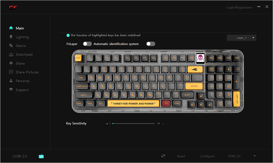 그리고, CK98 키보드 역시 전용 소프트웨어(S/W)를 제공해주고 있는데, YUNZII 홈페이지에서 다운로드 받을 수 있습니다. 소프트웨어를 설치해서 실행해 보면, 프로그램 인터페이스가 다른 경쟁사 키보드에서 사용하는 프로그램과 유사한 것을 확인할 수 있어서, 익숙합니다. 일단, 메뉴는 크게 Main, Lighting, Macro, Sketchpad, Share, Share Pictures, Personal, Support 총 8개인데, Main은 키 기능을 변경할 수 있는 메뉴로 프로파일 3개 지원과 10단계의 키 감도 조절도 함께 갖추고 있습니다. 그리고, Fn키 조합의 기본 설정을 활성화시키면, 색상별로 키 기능들을 구분해 주는데, 레드(Red)와 오렌지(Orange) 색상의 키들은 변경이 불가능하고, 나머지 색상의 키들은 키-조합, 매크로(Macro), 미디어(Media), 마우스(Mouse) 기능 중에 변경할 수 있습니다. Lighting 메뉴는 백라이트 설정으로 앞서 확인한 18가지 백라이트 모드 외에도 추가로 4가지 모드를 프로그램에서 선택할 수 있으며, 모드 방향도 변경할 수 있고, 색상 변경도 더 세심하게 변경할 수 있습니다. 그리고, Sketchpad는 애니메이션 GIF 이미지를 OLED 디스플레이에 적용할 수 있게 해 주며, Share와 Share Pictures는 매크로와 애니메이션 GIF를 서로 공유하는 곳으로 프로그램 회원가입을 통해 이용할 수 있습니다. 그리고, Personal 메뉴 역시 프로그램 가입을 통해 프로그램 사용목록이 저장된 것을 확인할 수 있으며, 마지막으로 Support 메뉴에선 펌웨어나 프로그램 업데이트를 할 수 있습니다.