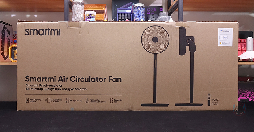 써큘레이터 역시 선풍기 제품군의 하나이기때문에, 제품박스는 그동안 스마트미 무선 선풍기의 제품들처럼 깁니다. 박스 전면에는 모델명과 함께 제품 디자인을 단색 그림으로 담고 있는데, 기존 Fan 2S나 Fan 3 모델과는 조금 다르다는 걸 미리 짐작할 수 있죠. 그리고, 모델명 아래에는 제품의 주요 특징으로 대용량 배터리, 어플 지원, 다양한 모드, 온도 감지, 자석방식 충전기를 언급하고 있습니다. 물론, 그동안의 스마트미 제품들처럼 이 써큘레이터 제품 역시 구글 어시스턴트(Google Assistant), 아마존 알렉사(Amazon Alexa), 애플 홈키트(Apple HomeKit) 어플 연동도 완벽하게 지원해주고 있죠. 그리고, 박스 측면에는 제품의 기본 사양 표기를 해놨으며, 패키지 구입 후 이동시 편의를 위해 손잡이도 기본 적용되어 있습니다.