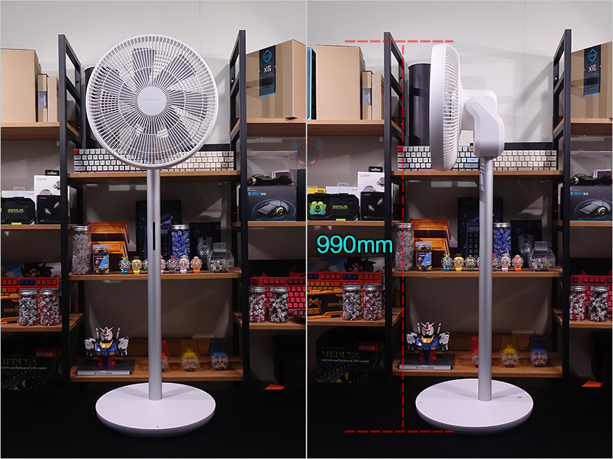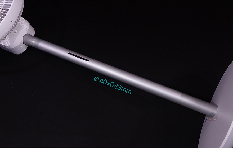 조립을 마친 스마트미 써큘레이터 선풍기(Smartmi Circulator Fan)를 살펴보면, 일단 높이는 990mm로 기존의 Fan 2S나 Fan 3보다 좀 더 높습니다. 아무래도 써큘레이터의 기능이 선풍기 역할도 있지만, 공기 순환도 해줘 야하기 때문에 높이가 좀 더 있어야겠죠. 그리고, 스탠드는 지름 4mm 굵기에 약 683mm 길이를 가졌으며, 소재는 기존 제품들과 동일하게 알루미늄입니다. 그리고, Fan 3 제품과 동일하게 스탠드 중간에는 작동상태를 확인할 수 있는 LED 인디케이터(Indicator)가 적용되어 있죠.