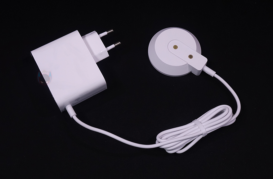 충전 어댑터 같은 경우에는 앞서 받침대 밑바닥에 확인했듯이 자석(magnet) 방식으로 쉽게 탈부착할 수 있게 갖추고 있는데, 일단 어댑터 플러그는 한국 규격에도 맞는 220V EU플러그이며, 소비전력은 최대 36W입니다. 그리고, 충전 접지 부분 밑바닥에는 미끄럼방지를 위해 패드를 부착해놨으며, 써큘레이터를 들고 접지부분 가까이 가면 자력에 의해서 저절로 부착되면서 충전이 작동됩니다. 기존에 삽입하는 방식보다 훨씬 편리하게 분리 장착할 수 있어서 좋습니다.