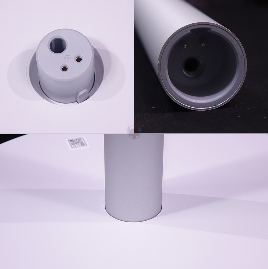 물론, 받침대 밑바닥에는 미끄럼방지와 바닥 접지력을 위해 총 5개의 패드가 부착되어 있으며, 방금 언급했던 후면 충전기 연결부는 뒤에서 확인하겠지만, 자석(magnet) 방식으로 갖추고 있죠. 기존의 Fan 시리즈 무선 선풍기 제품들과 가장 큰 차이점 중 하나입니다. 그리고, 받침대와 스탠드 연결은 기존 제품들과 마찬가지로 접지 부분을 맞춰서 끼워주면 되고, 고정은 제공되는 나사와 렌치를 사용하면 됩니다.