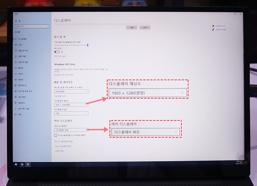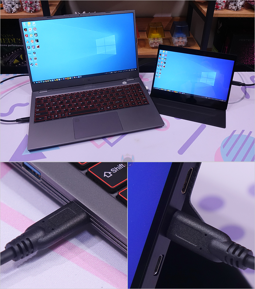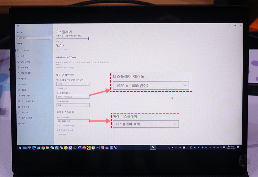직접, 제우스랩(Zeuslap) Z10T 포터블 모니터를 사용해보면, 일단 PC나 노트북에 연결할 때는 기본적으로 제공되는 전원어댑터로 전원을 연결하고, PC/노트북 화면은 제공되는 HDMI to mini HDMI 케이블을 사용해야 하지만, 최신 제품들 그러니깐 PC와 노트북에 썬더볼트 겸용 USB Type-C를 갖추고 있다면, 제공되는 USB Type-C to C 케이블만 사용해도 전원과 동시에 화면 연결이 됩니다. 다만, Z10T 포터블 모니터 화면비율은 16:10이기 때문에 운영체제에서 디스플레이 복제로 연결되는 16:9 비율로 화면 베젤 비율이 위아래 남으며, 16:10 비율로 사용하기 위해선 디스플레이 확장으로 연결해야 합니다.