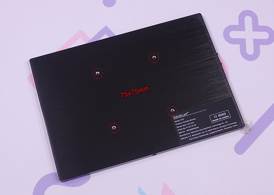 이 외에도 모니터 아랫부분에는 삼각대 같은 장치에 올려놓을 수 있게, 1/4인치 나사홀이 적용되어 있으며, 모니터 후면에는 모니터 암이나 벽걸이를 할 수 있게 75x75mm 베사홀을 갖추고 있습니다. 그리고, 후면 아래에 다시 한 번 제품 기본 사양 표기를 확인할 수 있죠. 참고로, 보호케이스까지 장착된 Z10T의 무게는 약 561g으로 태블릿 PC 무게와 비슷한 수준입니다.