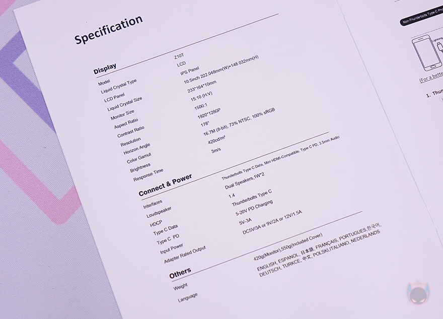 그리고, 시작에서 언급했듯이 Z10T 포터블 모니터는 터치 지원을 합니다. 총 10 포인트 터치를 지원하며, PC와 노트북에 연결했을 때 터치방식으로 프로그램과 기능들을 다룰 수 있습니다. 참고로 터치방식은 정점식 방식이며, 반응도 즉각적입니다. 그리고, 디스플레이 패널은 IPS 패널로 178도 광시야각을 가졌으며, 색재현율은 sRGB 100%입니다.