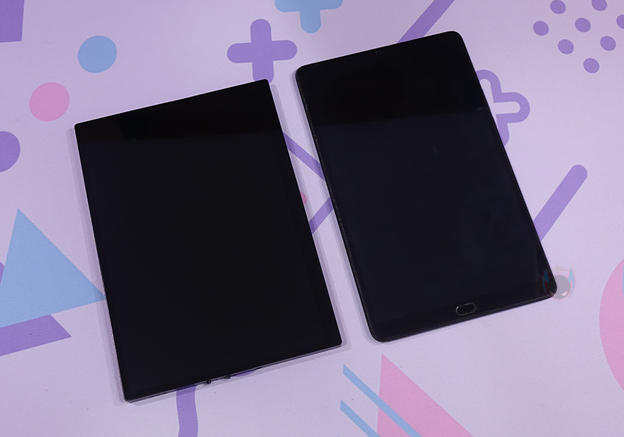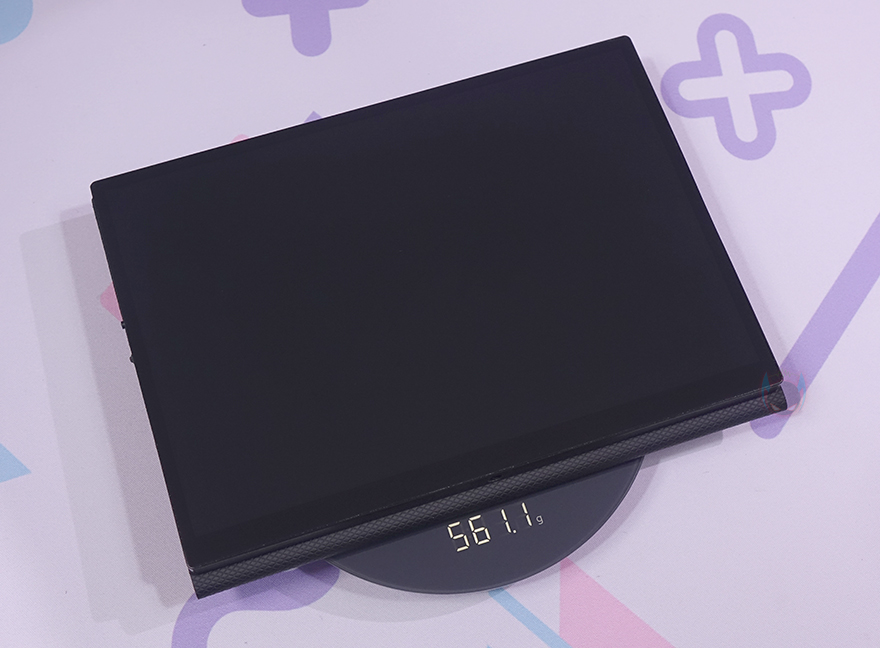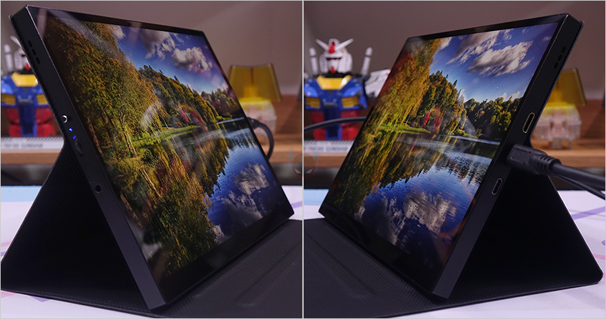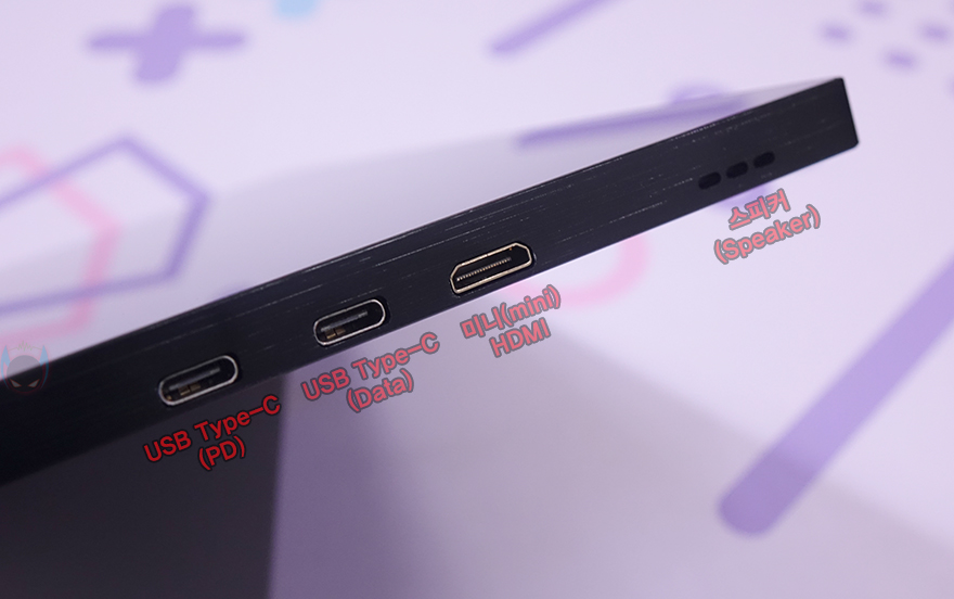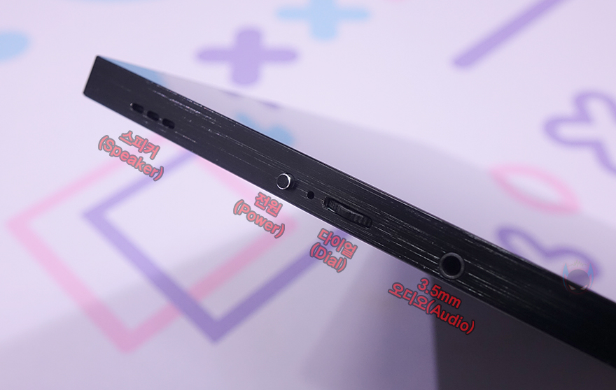 케이스를 분리한 상태에서 모니터를 살펴보면, 크기는 시작에서 언급했듯이 10.5인치 크기를 가졌는데, 일반적인 10~11인치 태블릿PC 크기와 비슷합니다. 다만, 뒤에서 확인하겠지만, 다양한 출력 포트를 갖추고 있기 때문에, 두께는 태블릿 PC보다 좀 더 두껍죠. 양쪽 측면에는 포트 및 버튼 등이 배치되어 있는데, 일단 양쪽에는 스피커가 맨 위에 배치되어 있으며, 그 아래로 오른쪽 측면에는 미니 HDMI, USB Type-C 포트 2개가 적용되어 있는데, USB Type-C 하나는 데이터, 하나는 PD 전원 역할을 합니다. 그리고, 왼쪽 측면에는 전원 버튼과, OSD 메뉴를 다룰 때 사용되는 다이얼, 3.5mm 오디오 포트가 배치되어 있죠.