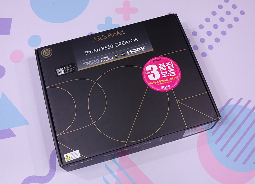 제품박스부터 살펴보면, 박스 디자인부터 기존 제품들과 다르죠. ASUS의 다른 메인보드 라인업 제품들은 박스 전면에 제품 이미지를 담는 반면에 ProArt B650-CREATOR는 제품 이미지가 없습니다. ProArt의 상징 컬러라 할 수 있는 블랙 색상에 골드 폰트색상을 박스 디자인에 그대로 적용하고 있습니다. 그래서, 전면에는 모델명과 함께 국내에서 가장 오랫동안 ASUS 메인보드를 정식수입하고 있는 STCOM의 3년 무상 보증스티커만 확인할 수 있죠. 물론, 모델명 아래에 칩셋, M.2 규격, 메모리 규격 같은 기본 지원 표기는 하고 있습니다.
