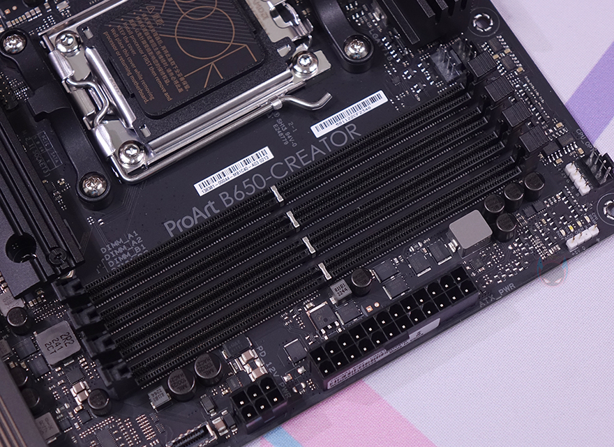 AMD B650칩셋 메인보드이기 때문에, 메모리는 DDR5를 지원하며, 슬롯은 총 4개를 갖추고 최대 128GB 용량까지 지원하며, 클럭은 현재 AMD DDR5 기준의 최대 메모리 오버클럭이라 할 수 있는 6400 MHz까지 지원을 합니다. 그리고, 주변에는 12V RGB 헤더와 5V ARGB 헤더, 부팅 시 작동상태를 체크하는 디버그 LED가 배치되어 있으며, 측면에 PCI 슬롯 보조전원 6핀과 USB 3.2 Gen2x2 Type-C 헤더가 배치되어 있습니다. 그리고, 메모리 슬롯 아래로는 메인 B650칩셋이 위치하는데 발열해결을 위해 기본 방열판이 장착되어 있으며, 디자인도 ProArt 콘셉트에 맞춰서 적용했습니다. 또한, 바로 오른쪽 측면에는 USB 3.2 내부 헤더와 S-ATA 6 Gbps 커넥터 2개가 배치되어 있죠.
