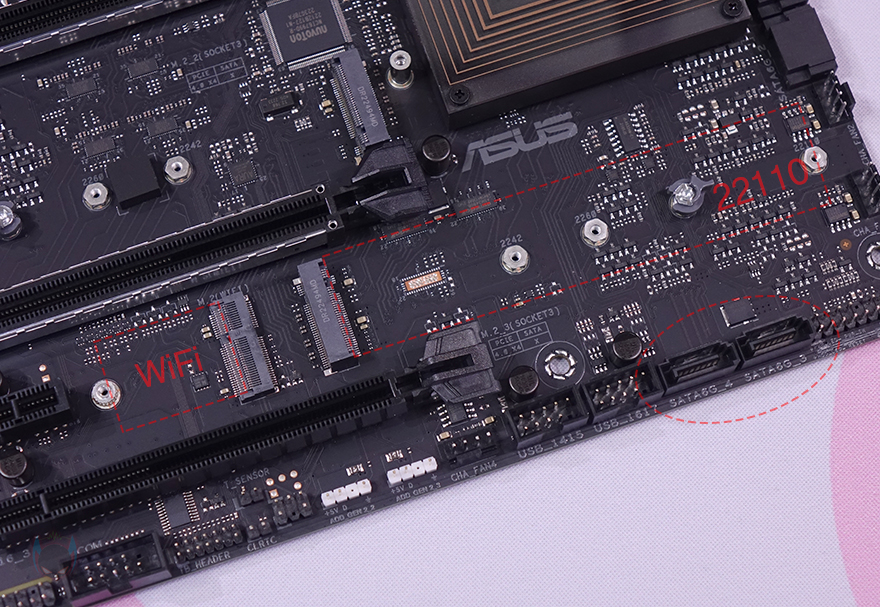 물론, 이외에도 PCIe x1 슬롯 바로 옆에는 WiFi 모듈을 장착할 수 있는 슬롯이 배치되어 있으며, 그 옆으로는 추가로 PCIe 4.0 규격의 M.2 SSD를 장착할 수 있게 슬롯을 갖추고 있는데, 22110 사이즈까지 장착할 수 있습니다. 그리고, 같은 위치에 맨 아래에는 추가 S-ATA 6 Gbps 커넥터 2개가 배치된 것을 확인할 수 있으며, 맨 아래 PCIe 슬롯 밑에는 역시 추가로 5V ARGB 헤더 2개가 배치된 것을 확인할 수 있죠. PCIe 슬롯 기준 맨 왼쪽에는 내장 오디오 부분으로 독립 PCB 구간 처리와 함께 자사 Prime 라인업 메인보드에서 볼 수 있는 크리스탈 사운드 표기와 함께 오디오 칩셋 부분에 EMI 실드를 적용하고 있습니다.