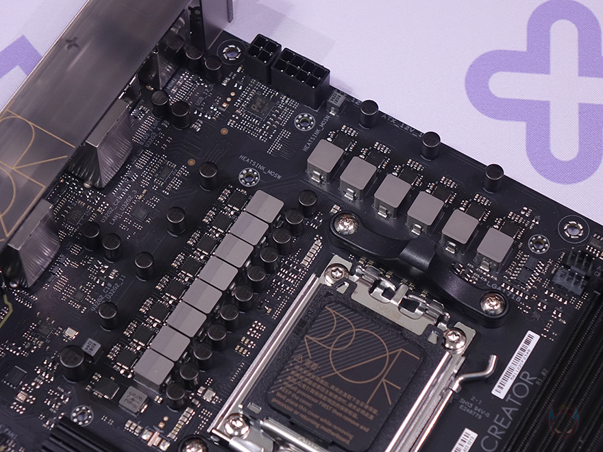 전원부 방열판을 떼어내 보면, 안쪽에는 전원 발열 해결을 위해 써멀 패드가 기본 부착되어 있는데, 모스펫과 초크 부분을 덮어줍니다. 전원부는 총 12+2 페이즈 구성으로 모스펫은 Alpha&Omega semiconductor사의 Dr.MOS로 개당 최대 60A 전류를 지원하며, 캐패시터는 TUF Gaming 라인업에 사용되는 것과 동일합니다. 당연히 페이즈 컨트롤 칩셋은 Digi+ VRM/EPU이며, ATX 보조전원도 8핀과 4핀 2개로 구성되어 있죠. 디지털 전원부 구성으로 B650칩셋 메인보드군에선 중급정도에 해당한다 볼 수 있습니다.