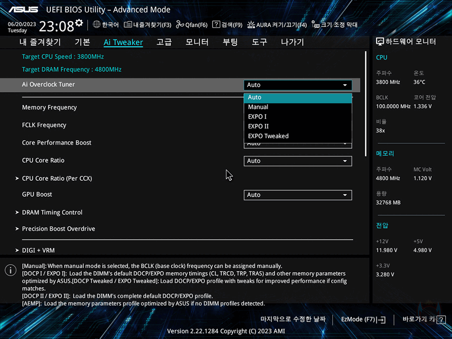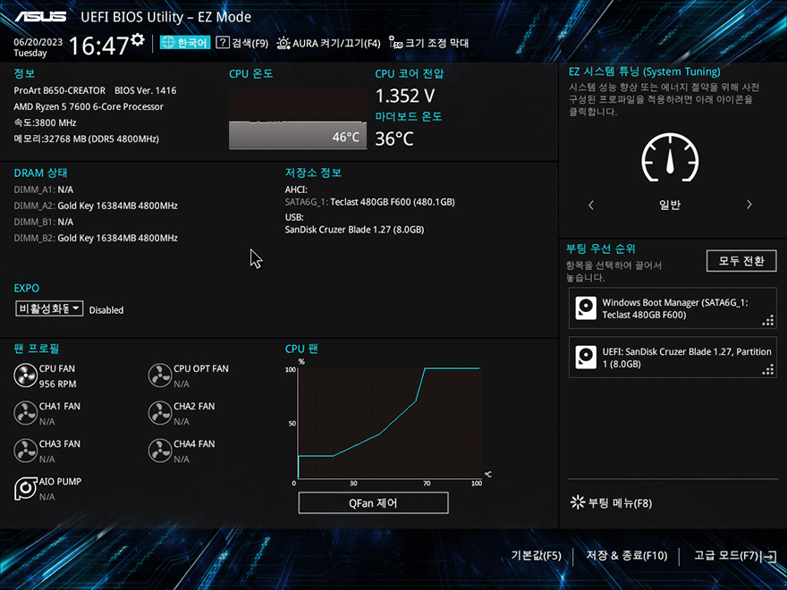 직접, ASUS ProArt B650-CREATOR 메인보드를 사용해 보면, 일단 바이오스 CMOS 인터페이스는 Prime 즉 ASUS의 기본 CMOS 인터페이스입니다. 당연히 한국어 지원을 해주고 있으며, F7키를 통해 EZ Mode와 Advanced Mode로 전환할 수 있죠. 고급설정인 Advanced Mode에선 기존 제품들처럼 즐겨찾기/기본/Ai Tweaker/고급/모니터/부팅/도구/나가기 메뉴 구성을 하고 있으며, AMD B650칩셋 같은 경우 CPU와 메모리 오버클럭을 지원하기 때문에 이에 따른 설정 메뉴도 갖추고 있죠.