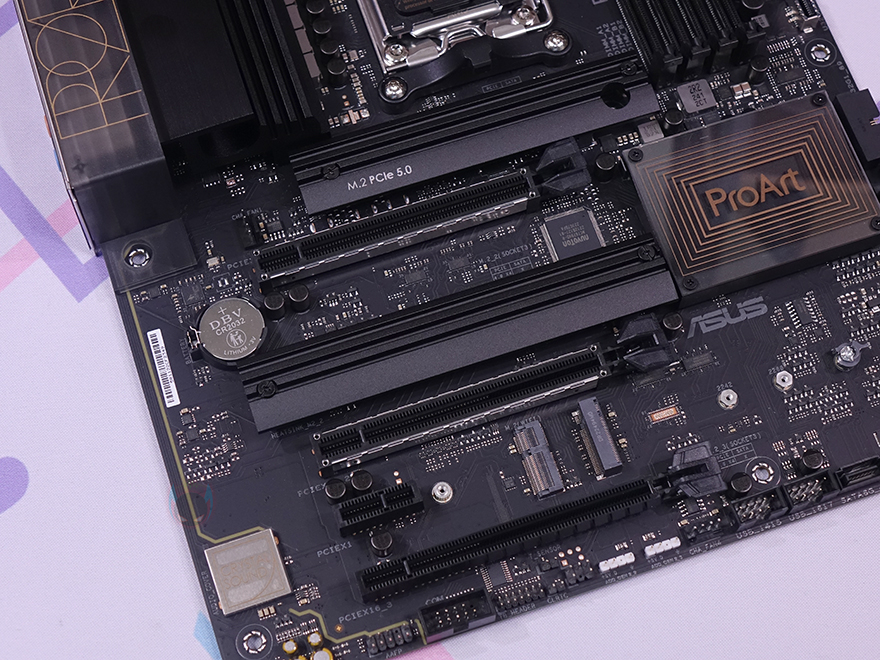 PCIe 슬롯과 M.2 SSD 슬롯 부분은 이 제품의 가장 큰 특징 중 하나라 할 수 있는데, 일단 그래픽카드가 장착되는 1번 PCIe 슬롯 바로 위에는 PCIe 5.0 규격의 M.2 SSD 슬롯 자리로 기본 방열판이 장착되어 있으며, 분리하면 2280 시리즈까지 장착할 수 있다는 걸 확인할 수 있으며, 무나사 방식의 Q-랜치 적용도 확인할 수 있습니다. 그리고, 1번 PCIe 슬롯 아래 2번 슬롯 역시 바로 위에 M.2 SSD 슬롯과 함께 방열판이 장착되어 있는데, PCIe 4.0 규격으로 역시 2280 사이즈까지 장착됩니다. 또한, 이 제품에서 주목할 부분은 바로 그래픽카드 슬롯인데, 1번 PCIe 슬롯은 기본적으로 x16배속까지 지원합니다. 그리고, 2번 PCIe 슬롯은 현재 시중에 판매 중인 모든 B650 메인보드들이 x4배속을 지원하는데, ProArt B650-CREATOR 메인보드는 x8배속까지 지원합니다. 그러니깐 1번과 2번 듀얼 x8배속을 지원하는 거죠. 이는 현재 B650 메인보드 중에 ProArt B650-CREATOR가 유일합니다. 그리고, 1번, 2번 슬롯 모두 내구성 강화를 위해 스틸 아머 디자인을 적용하고 있습니다. 또한, M.2 SSD 방열판 안쪽에도 모두 써멀 패드가 부착되어 있죠.
