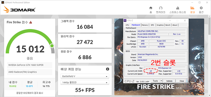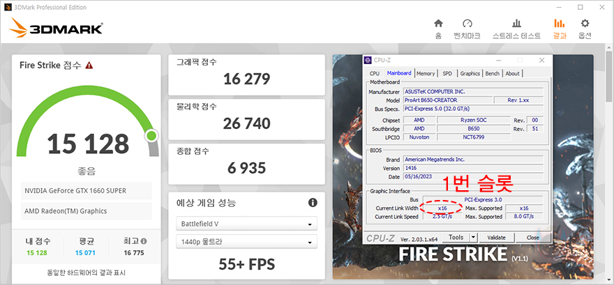 그리고, 앞서 언급했듯이 ProArt B650-CREATOR 메인보드는 현재 B650 메인보드 중에 유일하게 그래픽카드 2번 PCIe 슬롯까지 x8배속으로 지원합니다. 일반적으로 x16배속과 x8배속의 성능차이는 크지 않고, x4배속은 성능차이가 꽤 크죠. 실제로 ProArt B650-CREATOR 메인보드의 그래픽카드 PCIe 1번과 2번 슬롯에 각각 장착해서 벤치마크를 해 본 결과 점수차이가 크지 않은 것을 확인할 수 있습니다. 이렇게 2번 슬롯까지 x8배속으로 지원하면, PC구상을 다양하게 할 수 있습니다. 특히, PC케이스 구조에 따라서 그래픽카드 외에 확장 카드를 사용할 때, 굳이 1번 슬롯에 그래픽카드를 장착하지 않아도 되죠.