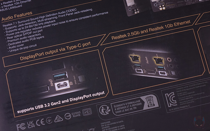 물론, 박스 후면에는 자사의 다른 메인보드 제품들처럼 제품 풀샷 이미지와 함께 지원 사양을 상세하게 표기하고 있는데, 가운데 이미지를 기준으로 오른쪽에는 CPU, 칩셋, 메모리, 모니터 출력, 슬롯, 저장장치 지원 사양을 표기해놨으며, 왼쪽에는 백패널 I/O 포트, USB 포트, 이더넷, 오디오 지원 사양을 표기해 놨습니다. 그리고, 아래에는 주요 특징으로 디스플레이 포트 지원의 USB 3.2 Gen2 Type-C, 듀얼 랜 포트, M.2 PCIe 5.0, 보안 서비스에 대해 표기해 놨죠.