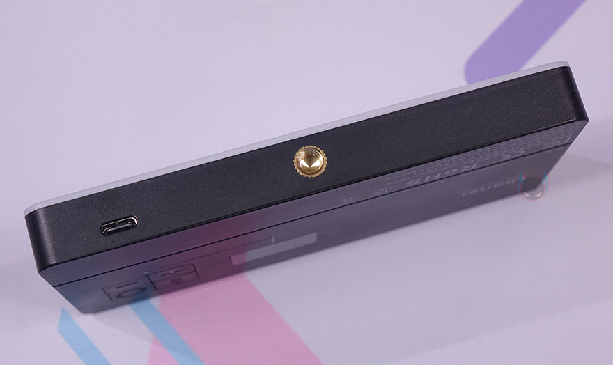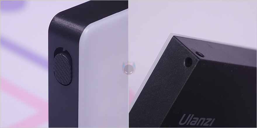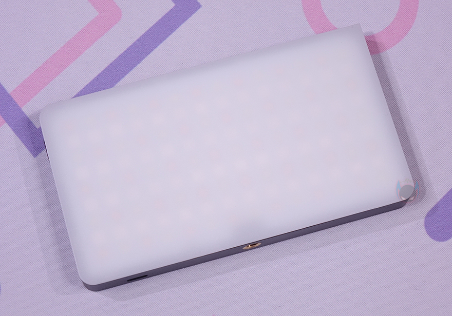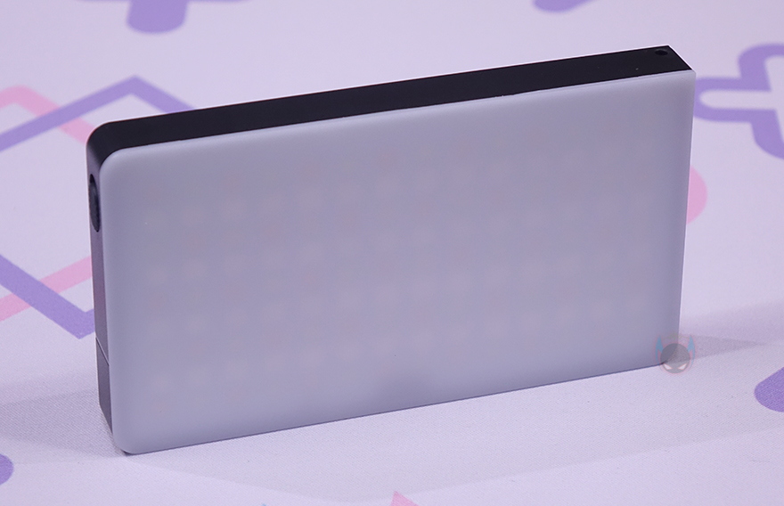 좀 더 자세히 살펴보면, 전면에는 조명 그러니깐 내부에 LED가 발산되는데, 내부에는 주광색을 위한 White LED가 35개, 전구색을 위한 Yellow LED가 35개 적용되어 있으며, 나머지는 모두 RGB 조명을 위한 LED로 총 56개가 적용되어 있습니다. 그리고, 측면 같은 경우에는 왼쪽 측면에는 전원 스위치(Power switch)가 배치되어 있으며, 오른쪽 측면에는 줄 같은 스트랩(strap)을 사용할 수 있게 홀 처리가 적용되어 있죠. 또한, 아랫부분에는 삼각대나 카메라 같은 부분에 장착할 수 있게 1/4인치 나사홀 적용되어 있으며, 왼쪽에는 USB 충전케이블과 연결되는 USB Type-C 포트가 적용되어 있습니다.
