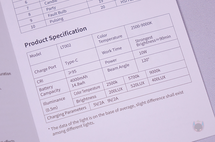 제품 박스를 열어보면, 외부 충격방지를 위해 스펀지 소재로 제품이 흔들리지 않게 폼 형태로 포장했으며, 제품 구성은 LT002 RGB 조명, 제품설명서, USB 충전케이블, 벌집모양의 커버(Honeycomb cover), 자석부착을 위한 철판(Magnetic patch) 2개로 이루어져 있습니다. 기존 제품들처럼 제품 박스에서 확인할 수 없었던 기본 사양은 제품설명서에서 확인할 수 있죠.
