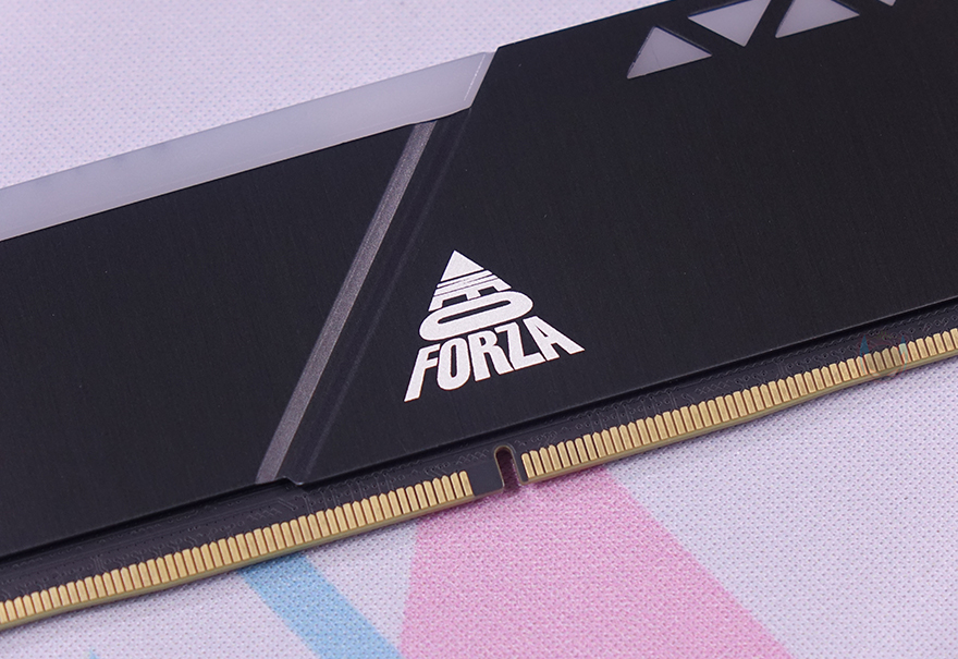 방열판 중간에는 로고(logo)를 새겨놨으며, RGB 효과를 볼 수 있는 상단 LED 바(bar)는 측면에서 봤을 때 반으로 나뉘어 한쪽은 그대로 노출된 디자인이고, 나머지 반은 방열판 일부가 덮힌 디자인입니다. 또한, 방열판 반대쪽 한쪽에는 역시 Neo Forza를 새겨놨으며, LED 바 상단에도 동일하게 표기를 하고 있죠.