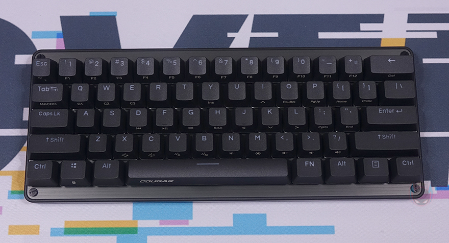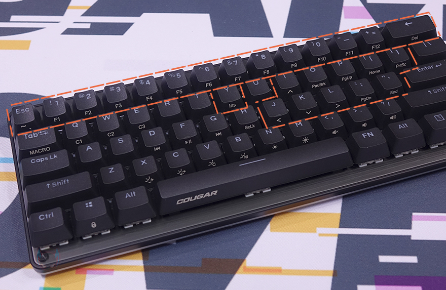 끝으로, 쿠거 PURI MINI RGB 키보드 역시 Fn키 조합으로 부가 기능들을 지원하고 있는데, 그전에 미니 키보드이기 때문에 풀-배열 키보드에서 볼 수 있었던 F숫자키나 방향키, 특수키들도 역시 Fn 조합으로 사용됩니다. 그리고, 앞서 키캡에서 언급했듯이 Fn키로 사용되는 기능들은 모두 키캡 측면에 표기되어 있기 때문에 쉽게 구분이 가능하며, 부가기능에는 Fn키 바로 위에 </>/? 키가 볼륨조절 및 음소거, N/M키는 RGB 백라이트 밝기조절 기능으로 배치되어 있으며, 그 옆으로 B키는 RGB 백라이트 모드 전환, V키는 RGB 백라이트 단색변경, C키는 모드 방향전환, X키는 모드 속도조절 기능이 되겠습니다. 그리고, 그 위로 D/F/G키는 재생컨트롤, Tab키는 매크로모드, Q/W/E키는 프로파일 기능으로 지원하고 있죠. 물론, ESC키와 윈도우키도 각각 설정초기화와 윈도우키 잠금/해제 기능을 가지고 있습니다. 마지막으로 분리형 USB 전원케이블은 총 1.8m 길이에 신호손실 최소화를 위해 노이즈필터가 적용되어 있으며, 연결 인터페이스는 USB Type-C to A로 갖추고 있습니다.