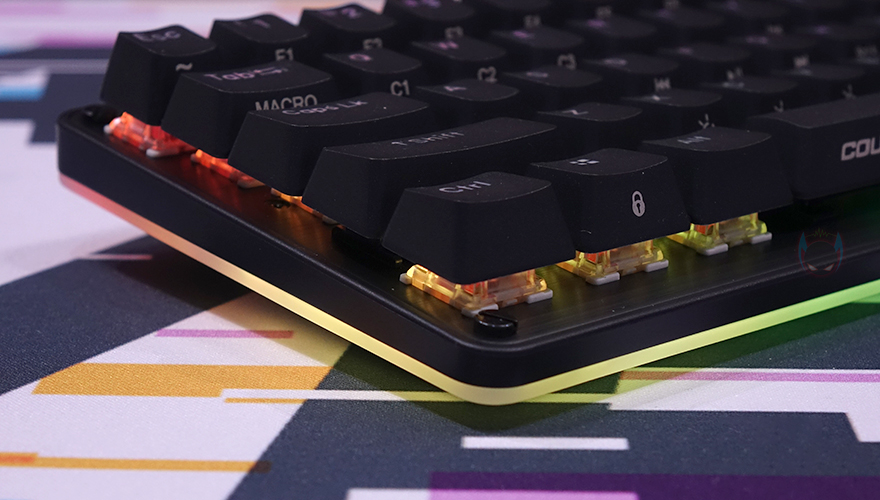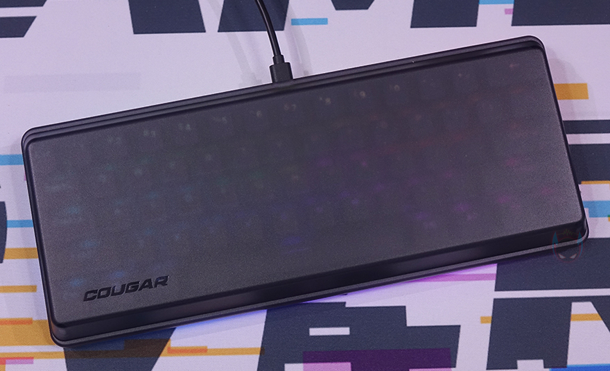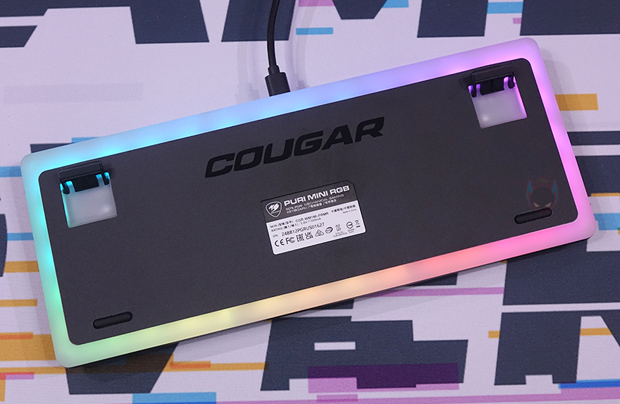 직접, 쿠거(COUGAR) PURI MINI RGB 키보드를 사용해 보면, 키보드에 전원이 들어오면 바로 RGB 백라이트 효과를 볼 수 있으며, 키보드 측면과 밑바닥에도 적용된 백라이트 효과를 확인할 수 있습니다. 그리고, 루프 덮개가 반투명이기 때문에 백라이트 상태에서 덮어도 은은하게 색상 구분정도로 투과되는 것을 확인할 수 있죠.