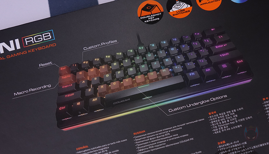 제품박스부터 살펴보면, 전면에는 모델명과 함께 제품 이미지 그리고 주요 특징으로 이중사출 PBT 키캡, 윤활처리된 스위치, PIX 소프트웨어 지원, RGB 조명효과를 표기해놨습니다. 그리고, 박스 측면에는 각각 제품의 기본 사양과 스위치 구분 표기를 확인할 수 있는데, 그동안 쿠거는 자사 기계식 키보드에 체리와 자사 커스텀 스위치 2가지를 주로 사용해 봤는데, 이번에 처음으로 게이트론 스위치를 사용했습니다. 참고로, 현재 판매 중인 스위치는 적축만 있습니다.