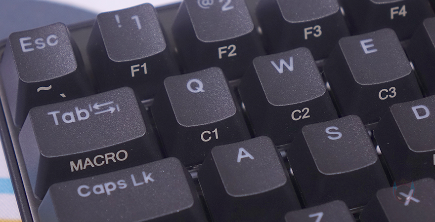 이번엔 매크로 기능을 확인해보는데, 매크로 사용은 먼저 Fn+Tab키를 누르면 Tab키에 백라이트가 화이트색상으로 깜빡입니다. 이때가 녹음 입력모드로 입력값을 입력하면 되고, 입력 후 다시 한번 Fn+Tab키를 누르면 약간 더 빠르게 화이트 색상이 깜빡이는데 이때는 입력값을 저장할 키를 선택하는 겁니다. 저장할 키를 선택한 후, 해당 키를 누르면 입력했던 값이 자동으로 입력되는 것을 확인할 수 있죠.
