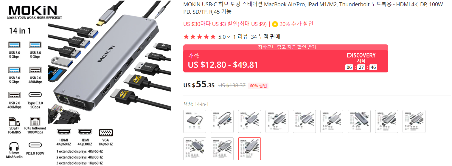 요즘 노트북들은 슬림한 두께를 강조하는 경우가 많다. 무게가 가벼워지는 효과도 있지만, 반대로 포트수가 제한되는 단점도 있다. 이렇다보니 USB 허브를 사용하는 이용자들이 점점 늘어나고 있는데, USB 외에 모니터나 랜 포트까지 갖춘 다중 포트 허브를 사용할려면 USB-C 허브를 사용해야한다. 미국 시장에서 이미 활발히 활동하고 있는 MOKiN이 최근 알리익스프레스에 입점하면서 주력인 USB-C 허브 제품을 판매하기 시작했는데, 이번 프로모션 상품으로도 선정되었다. 특히, 이번 프로모션과 피스커뮤 전용할인코드를 사용하면 더 저렴하게 구입할 수 있으니 USB-C 허브 구입계획이 있었다면 절대 놓치지 말자!
