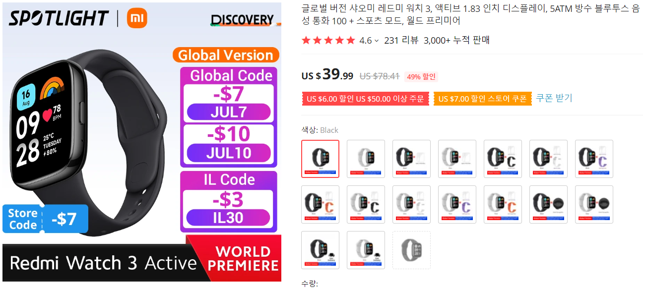 샤오미의 레드미 브랜드는 국내 소비자들에게도 가성비 브랜드로 잘 알려져 있는데, 올해 레드미 워치3가 큰 인기를 얻으면서 최근에 좀 더 가격을 줄인 액티브 버전 흔히 말하는 청춘판 버전을 출시했다. 크기는 동일하고, 해상도를 조금 낮췄지만, 가장 큰 핵심 기능인 블루투스 통화 기능을 그대로 유지하고 있으니, 평소 관심있었다면 이번 프로모션 때 좀 더 저렴하게 구입하자.
