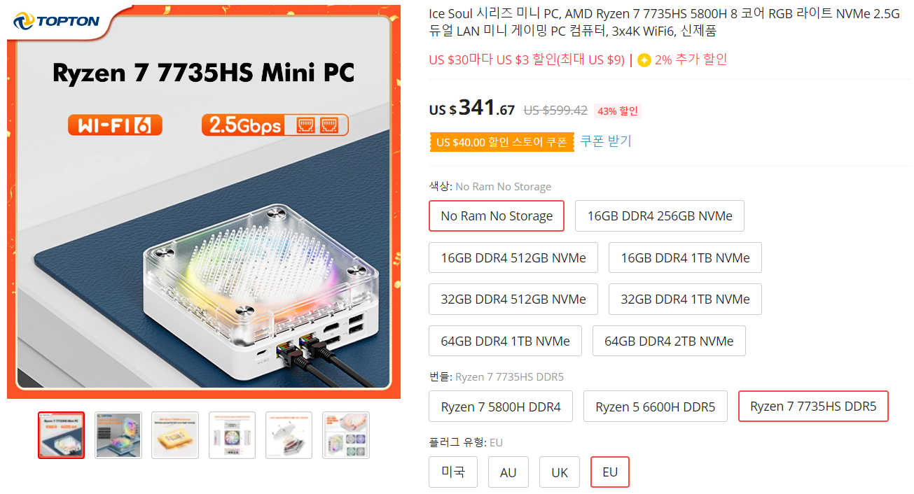 대부분의 미니PC들은 작은 규모로 만들어지기때문에 불필요한 요소들을 최소한으로 줄인다. 데스크탑PC하면 RGB가 트렌드인데, 미니PC에선 이런 RGB 효과가 불필요한 요소라고 생각해서 빠지는 경우가 많기때문에 보기 드문데, Topton에서 최근 RGB 효과가 적용된 Ice Soul 미니PC를 출시했다. 라이젠 5800H/6600H/7735HS CPU 중 선택할 수 있고, No RAM/No Storage 옵션까지 있으니 RGB 미니PC를 원했다면 참고해보자.