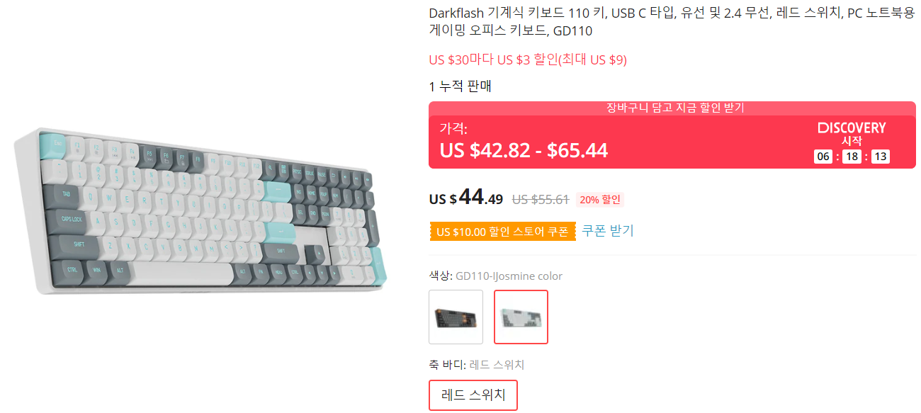 Aigo의 글로벌 브랜드 다크플래쉬는 Aigo A시리즈 키보드 글로벌버전을 GD 시리즈로 함께 출시하고 있다. 그동안 색상까지 동일하게 나왔는데, 최근에 다크플래쉬 버전으로만 새롭게 나왔다. 그래서, Aigo에는 없던 적축 스위치가 추가되었고, 키캡 색상도 다르다. GD110은 110키 풀-배열이라 익숙하게 사용할 수 있고, 유무선과 PBT 키캡 유지를 하면서 이번 프로모션에서 더 저렴하게 판매되고 있으니 놓치지 말자.