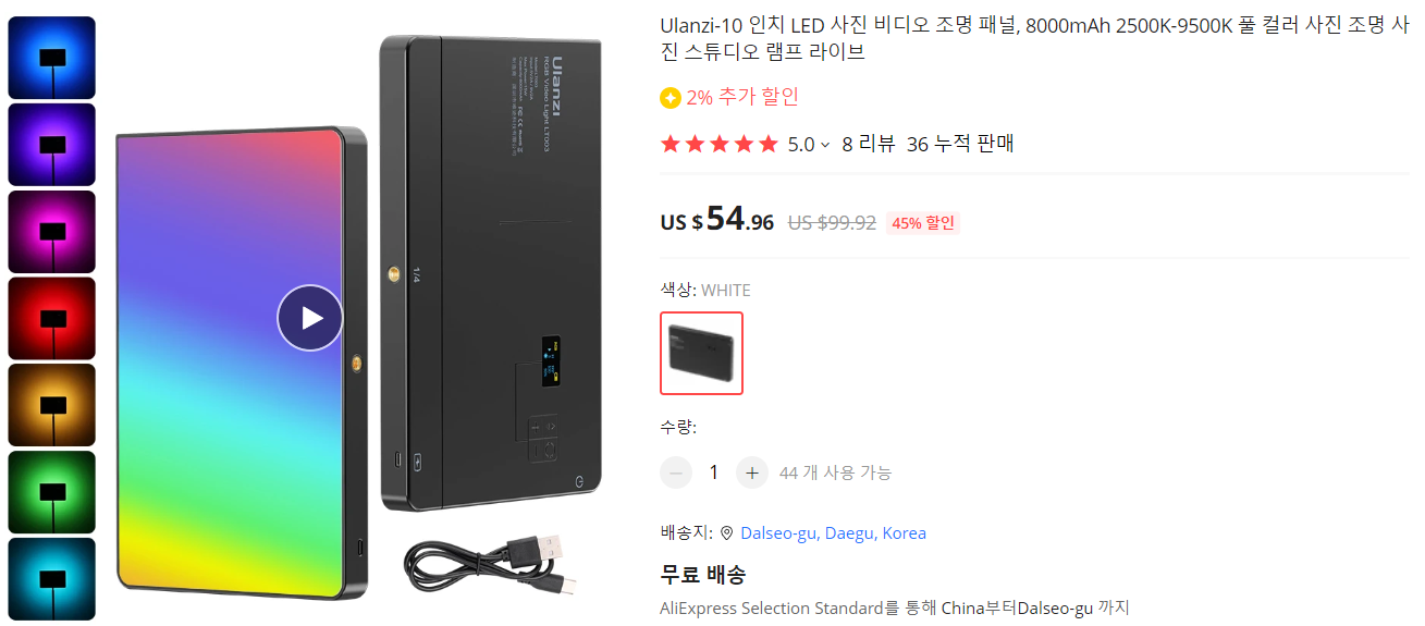 브이로그나 뷰티 콘텐츠 등 개인 촬영을 하는 소비자들도 이제는 조명이 필수다. 그래서, 요즘 조명은 가성비로 나오는 경우가 많은데, 가성비 조명하면 빠질 수 없는게 울란지(Ulanzi)다. 특히, 울란지의 LT003 조명은 10인치 크기에 배터리 내장과 RGB 조명모드, 색온도 조절까지 모두 갖추고 있어서 조명으로써 만족도가 높은 제품인데, 이번 할인 프로모션에는 선정되지 않았지만, 저렴한 가격에 할인코드는 적용되지 관심있었다면 한 번 생각해보자.