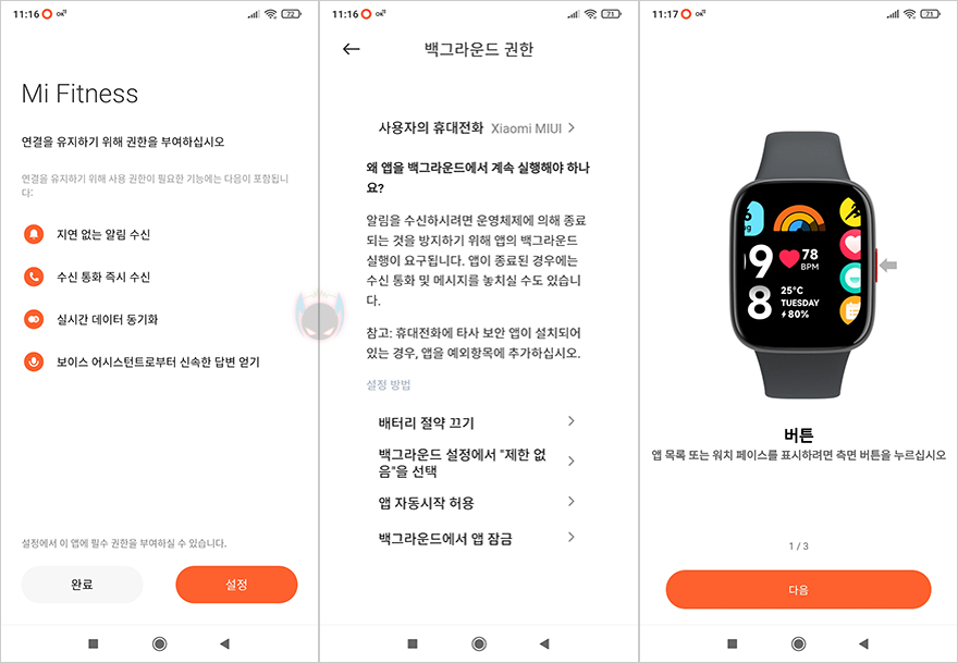 직접, 샤오미 레드미 워치 3 액티브(Redmi Watch 3 Active)를 사용해보면, 일단 전원버튼을 눌러 전원을 켜면 언어선택이 가장 먼저 나오는데 글로벌버전 제품 같은 경우 한국어를 포함하고 있으며, 언어 선택 후, QR코드로 앱 설치와 스마트폰 연동을 진행을 합니다. 앱(App)은 Mi Fitness가 사용되며, 앱 설치 후 장치 추가에서 기기 검색 혹은 스캔을 통해 어렵지 않게 안내에 따라 연결할 수 있습니다. 물론, 연결 진행 중간에는 설정부분을 통해 백그라운드 실행이나 알림 앱을 선택적으로 할 수 있으며, 설정 후에도 변경할 수 있습니다.
