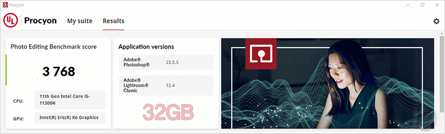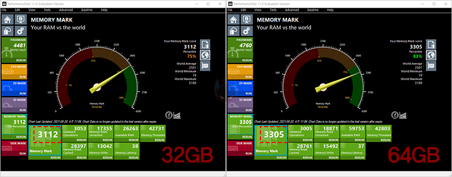 먼저 노트북에서 비교를 해봤는데, 인텔 CPU기반의 노트북 경우 클럭 비율과 용량에 따라 성능 차이가 확연한 부분이 있고, 크지 않은 부분도 있다. 가장 기본적인 AIDA64-Memory Benchmark에선 동일한 클럭과 램 타이밍을 가지고 있어서 레이턴시 차이가 크지 않지만, 용량의 차이가 있어서 읽기/쓰기/복사에 대한 대역폭 차이가 분명 있는데, 특히 복사 대역폭 용량이 KingBank SODIMM DDR4 64GB용량답게 더 많은 것을 확인할 수 있습니다. 그리고, Passmark PerformanceTest에 메모리 벤치마크에서도 역시 32GB와 64GB 용량 차이로 성능 차이가 있는 모습을 보여줬고, PCMark10과 Procyon 포토샵 사진 편집 벤치마크에서도 역시 KingBank SODIMM DDR4 3200MHz 32GBx2(64GB)가 좀 더 나은 모습을 보여줬습니다.