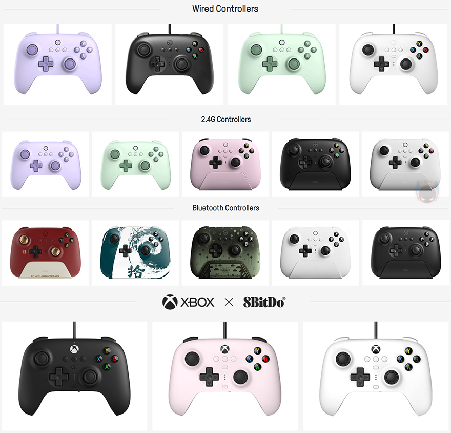 본격적으로 8Bitdo 얼티메이트 2.4G 무선 컨트롤러를 살펴보기 전에 시작에서 잠깐 언급했듯이 얼티메이트 시리즈(Ultimate series)는 현재 다양하게 나오고 있습니다. 크게는 4가지로 분류할 수 있는데 유선(wired), 무선 2.4G, 블루투스(Bluetooth), 그리고, XBOX 버전이죠. 그리고, 무선 2.4G 모델에선 충전독(charging-dock) 유무에 따라 다시 나뉩니다. 또한, 가장 최근에는 블루투스 제품에 한정판 모델까지 더해졌죠. 선택폭이 상당히 넓기 때문에 소비자입장에선 게임환경에 따라 선택할 수 있어서 좋습니다.