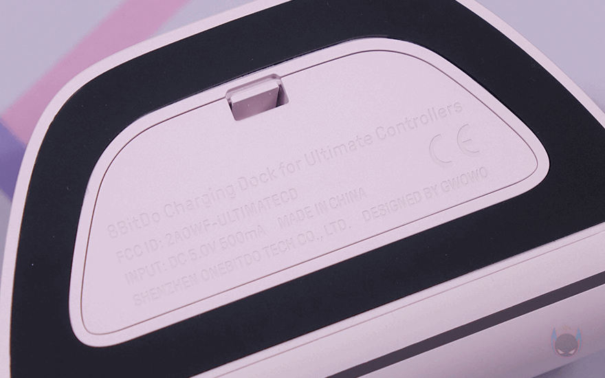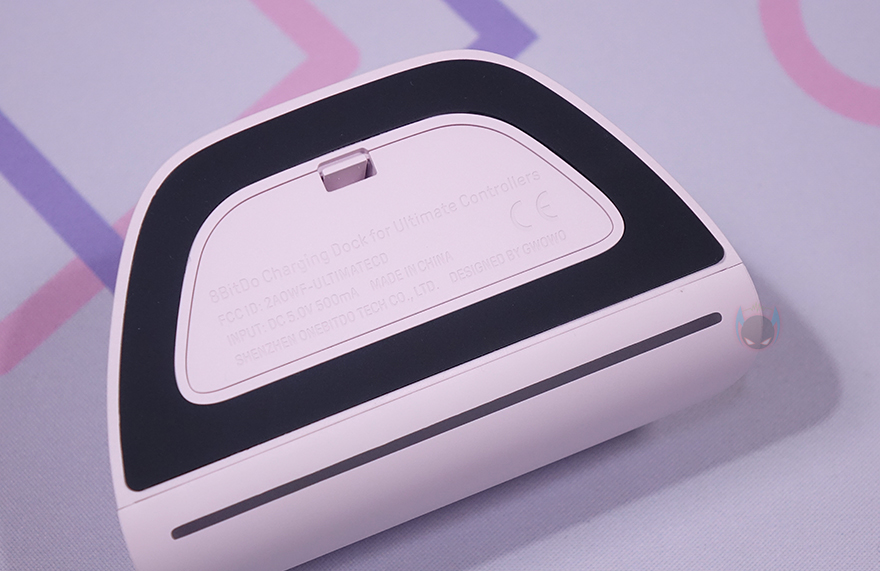 앞서 제품박스에서 잠깐 언급했듯이 충전독(charging-dock) 역시 컨트롤러 색상에 맞춰서 적용하고 있으며, XBOX 컨트롤러처럼 거치대에 얼티메이트 2.4G 무선 컨트롤러를 올려놓기만 하면 됩니다. 측면에서 보면 약간 뒤로 기울어진 형태로 거치되며, 충전독만 따로 좀 더 살펴보면, 전면에 음각으로 로고(logo)를 새겨놨으며, 후면에는 USB충전케이블과 연결되는 USB Type-C 포트가 배치되어 있죠. 또한, 충전독 전면에서 아래로 내려가면 충전상태를 확인할 수 있는 LED 램프를 바(bar) 형태로 길게 적용해 놨습니다.