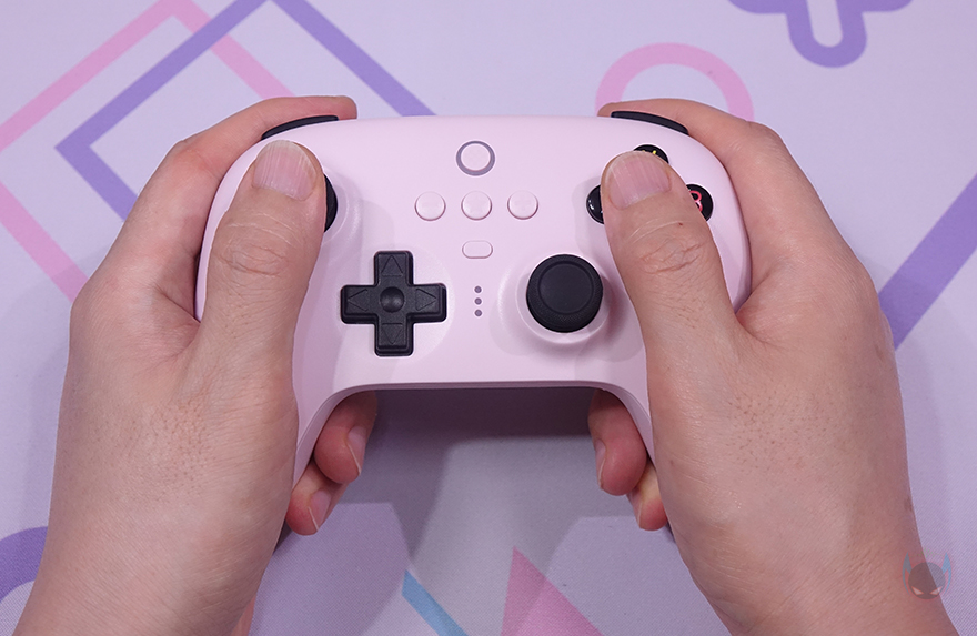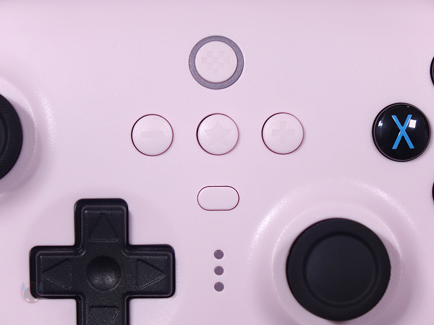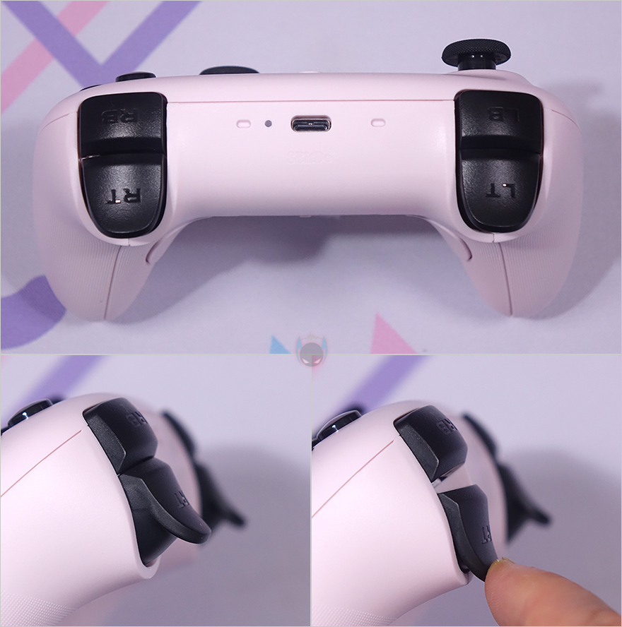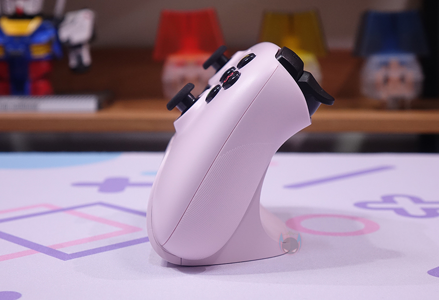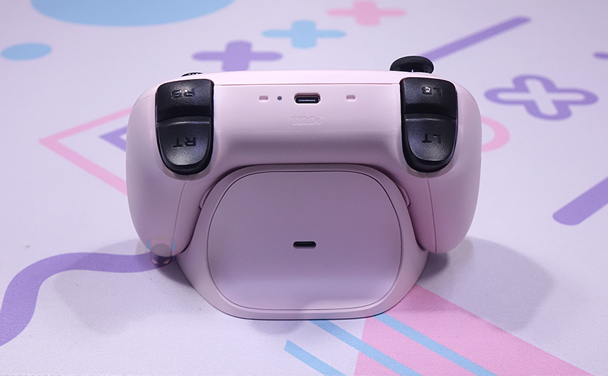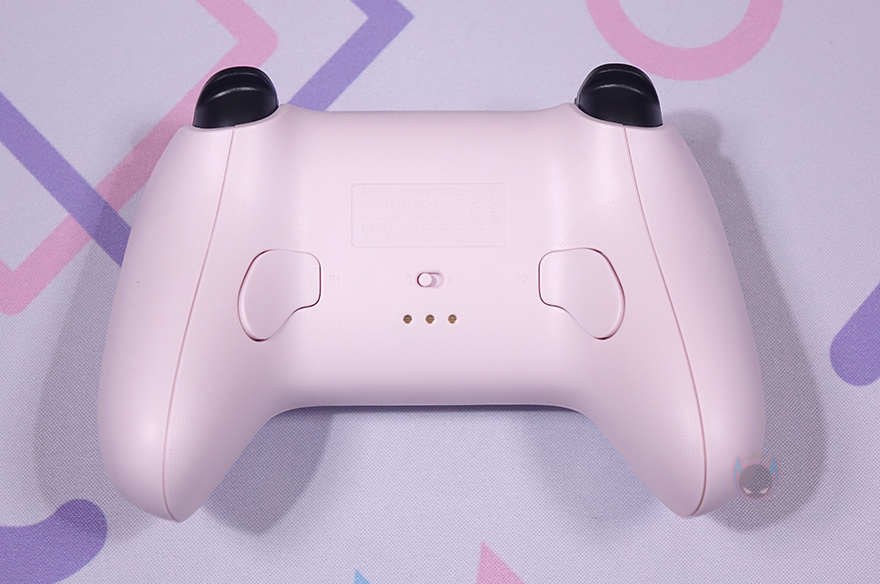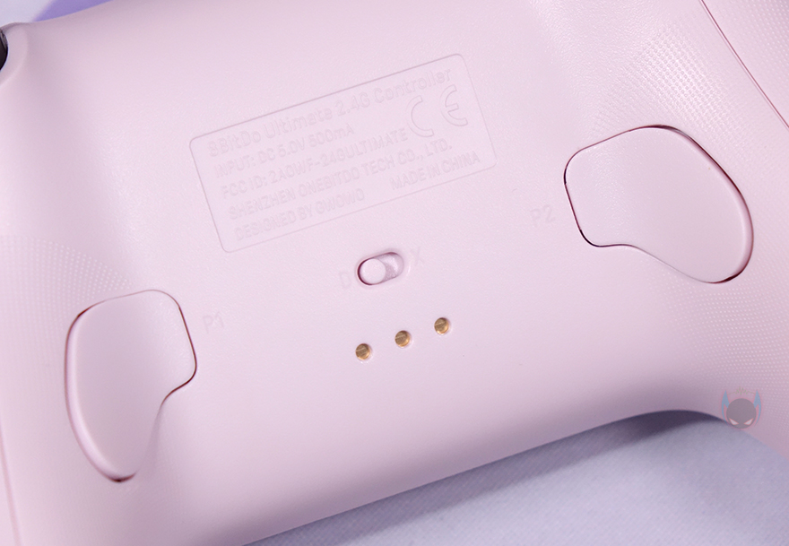컨트롤러 전면에는 중앙에 유선 사용시 USB 케이블과 연결되는 USB Type-C 포트가 배치되어 있으며, 바로 옆에 전원 상태 표시등도 배치되어 있습니다. 그리고, 양쪽에는 각각 왼쪽 버튼(LB)/트리거(LT), 오른쪽 버튼(RB)/트리거(RT)가 배치되어 있죠. 후면 역시 양쪽에 P1/P2 버튼이 배치되어 있으며, 중앙에는 운영체제에 맞춰 모드변경을 할 수 있는 스위치가 적용되어 있는데, 윈도우(Windows) 운영체제에선 X, 안드로이드(Android) 운영체제에선 D를 선택하면 됩니다. 그리고, 아래에는 충전독과 연결되는 접지가 적용되어 있으며, 양쪽 손잡이 부분에는 그립시 미끄럼방지를 위해 엠보싱 디자인(embossing design)을 적용하고 있죠.